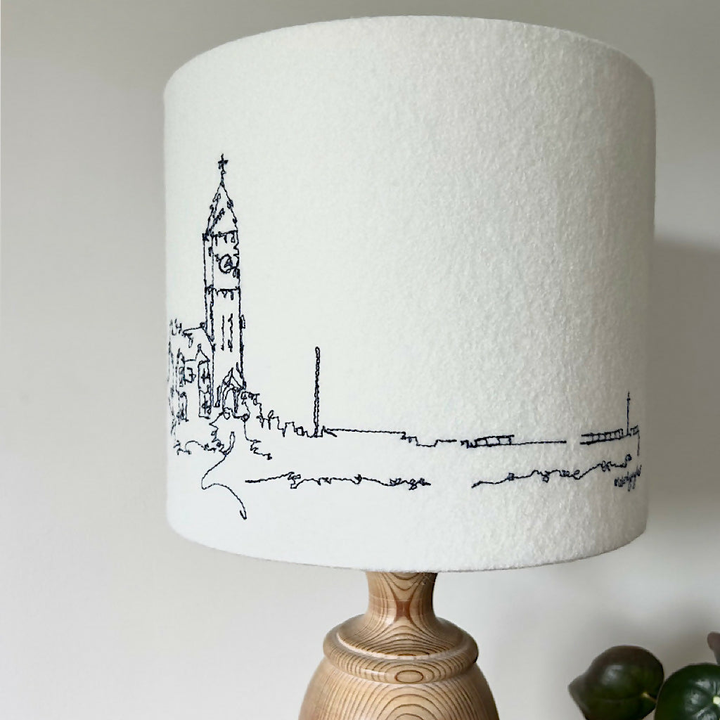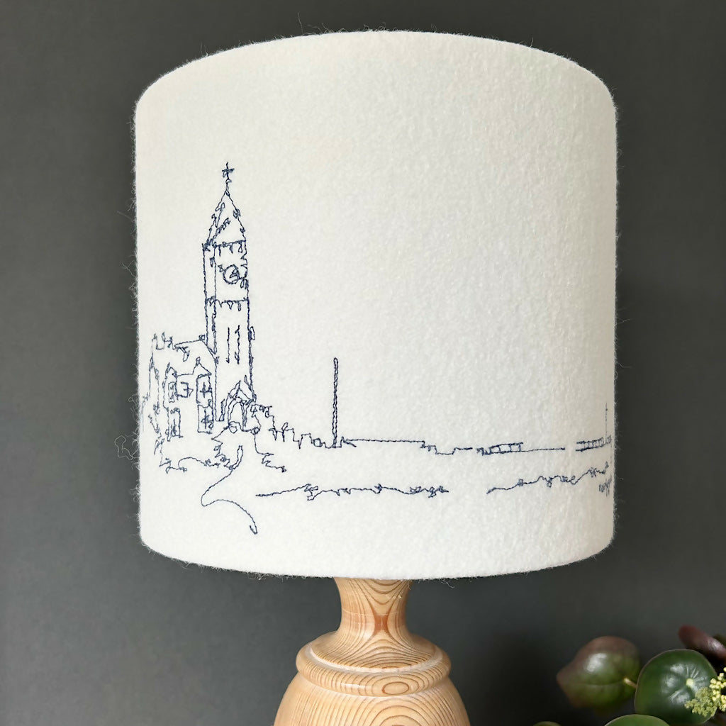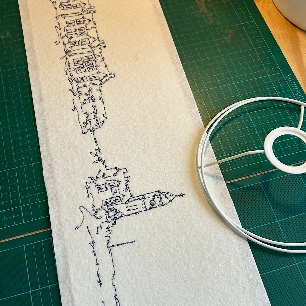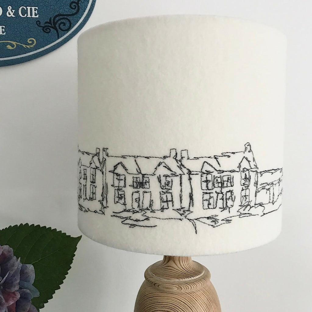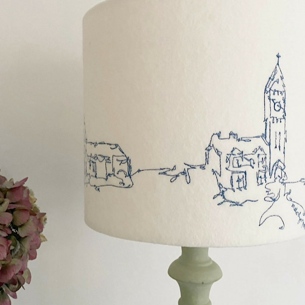 A freehand machine embroidered Porthleven lampshade. A neutral colour felt background using the colour stitch of your choice to stitch the Porthleven scene of Bay View Terrace and the Clock Tower.