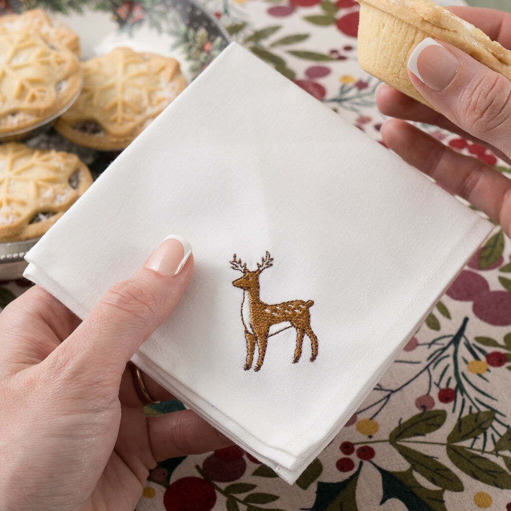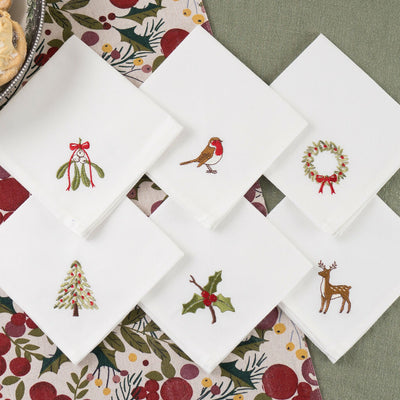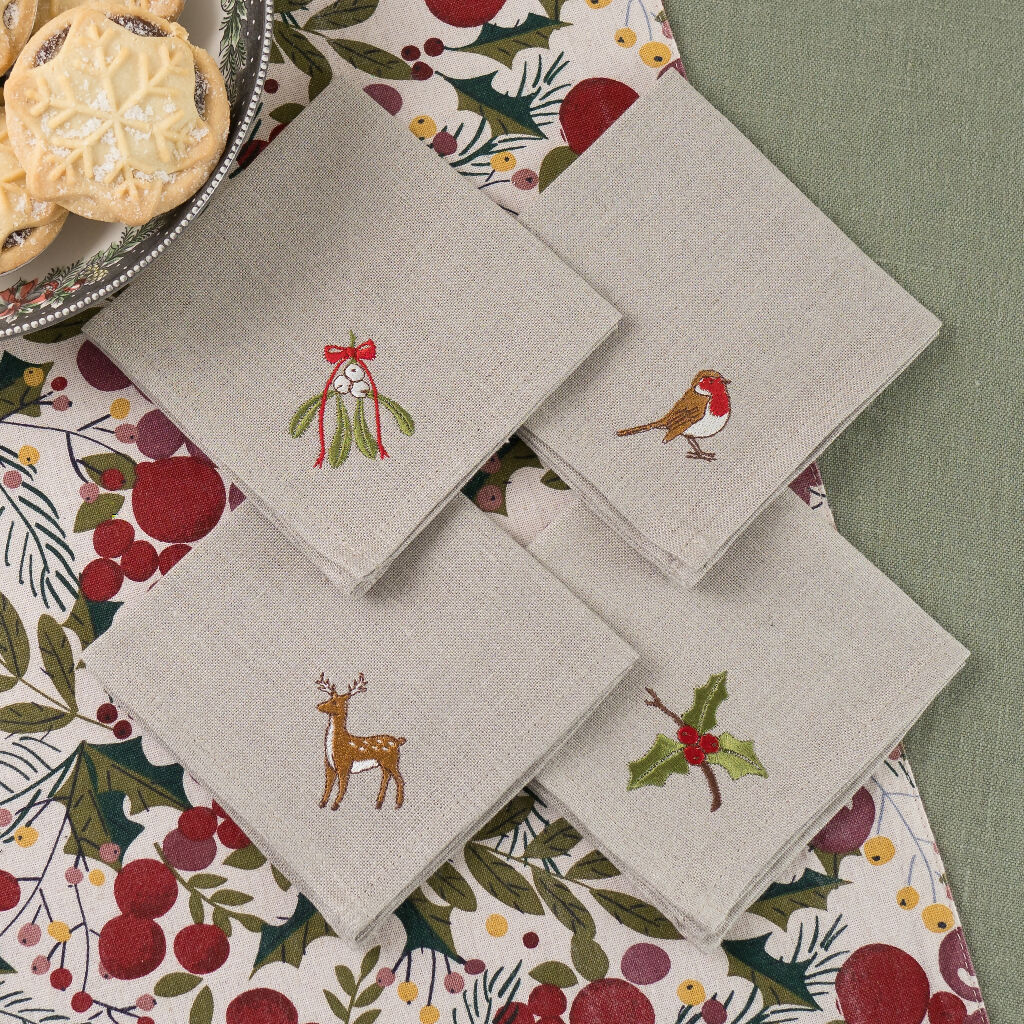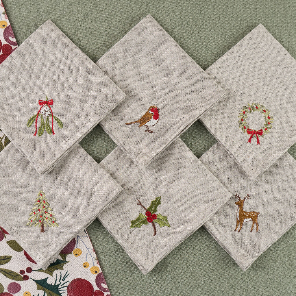 Featuring a holly, mistletoe, robin and reindeer motif in the set of four, or with the addition of the wreath and pine tree motifs in the set of six, these napkins match our Woodland Reusable Christmas crackers perfectly to complete a sophisticated Christmas day table.