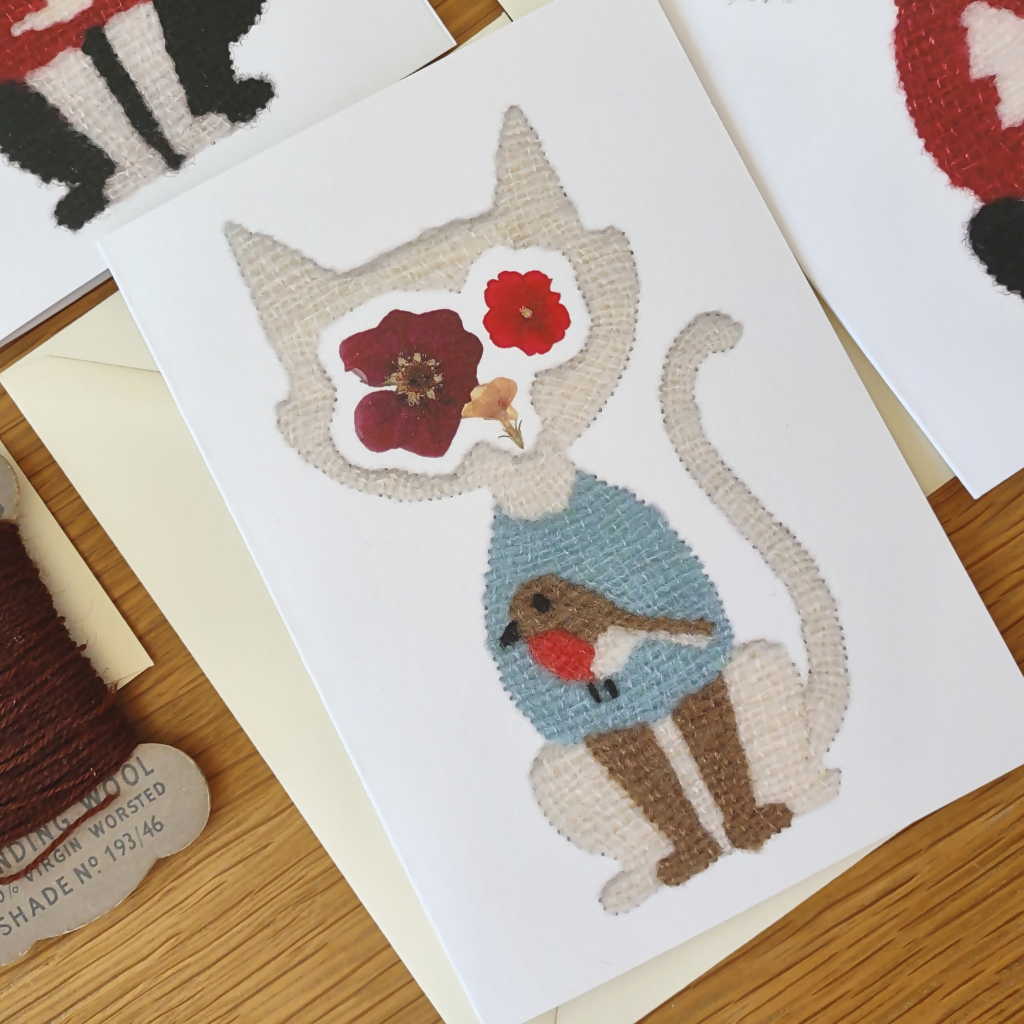 If you love bird watching meet your kindred spirit Eugene! Eugene the cat loves bird watching, and has even made her own jumper with a robin stitched on it, captured here in this cat Christmas card.