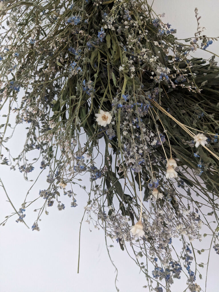 This 40cm handmade wreath is crafted from organically grown, air-dried forget me not and touch of gypsofilia in soft pale blue and white hues. Delicate, timeless, and full of natural charm, it’s a beautiful way to bring a touch of the garden indoors.