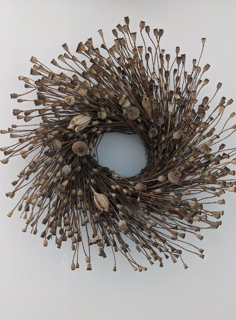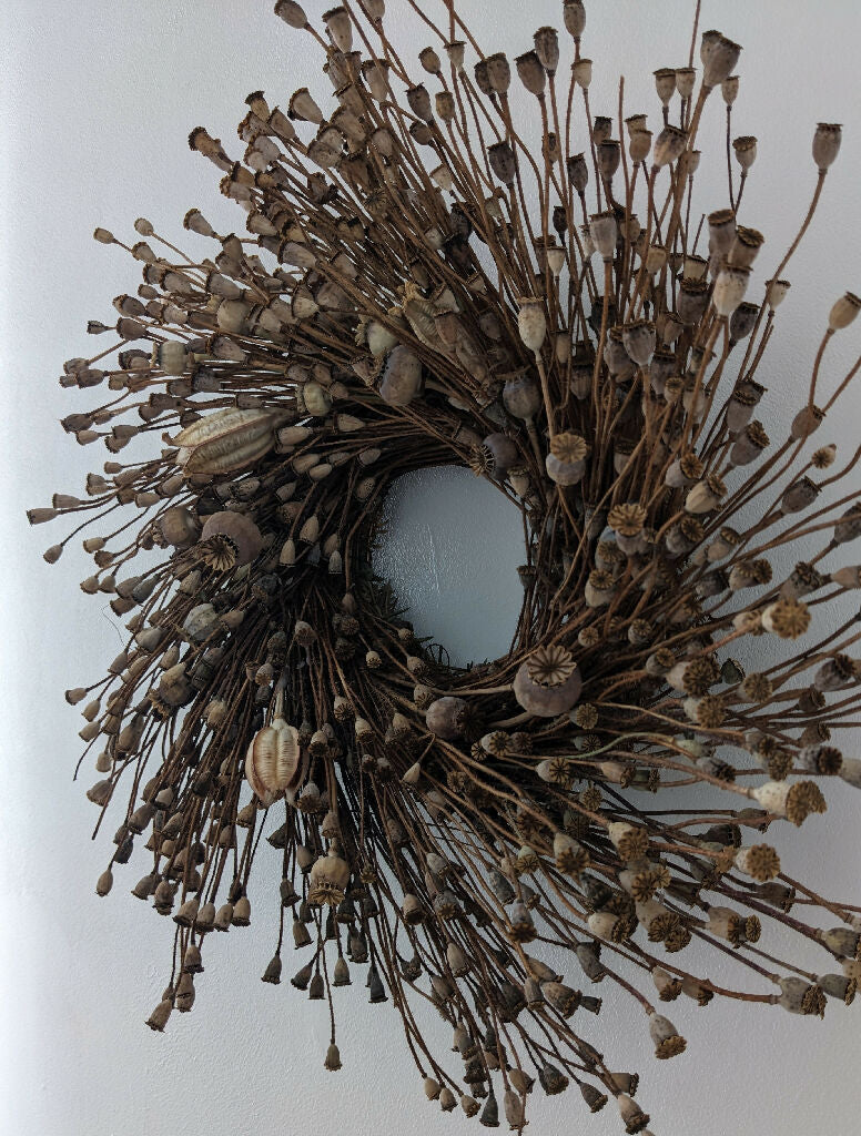 A striking handmade wreath crafted entirely from natural wild poppy seed heads. Measuring approximately 45cm in diameter, it brings beautiful texture and a touch of rustic charm to any space.