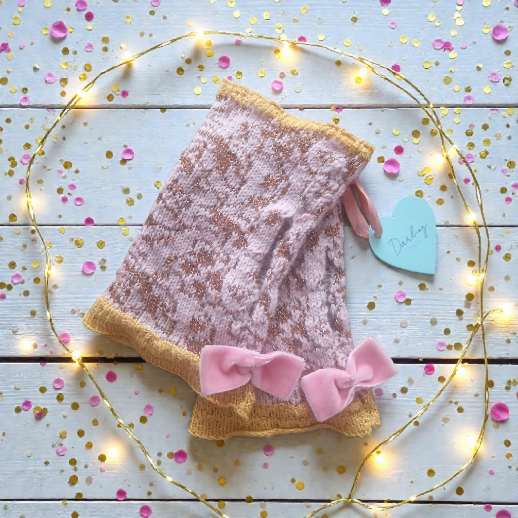 Add a touch of vintage romance with these beautifully crafted gloves, featuring a delicate floral sparkly pattern. Knitted from soft cotton with lurex for sparkle and finished with a bamboo edge for a gentle, comfortable feel, they are completed with pink velvet bows for a timeless, feminine touch.