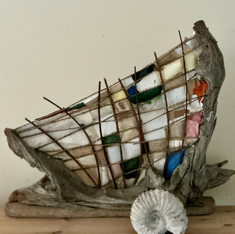 Handmade coloured papers are layered over braided seagrass and willow web, all set in a salvaged Caladonian cedar driftwood. The seagrass and willow beneath add texture, the frame is bleached silver-grey.