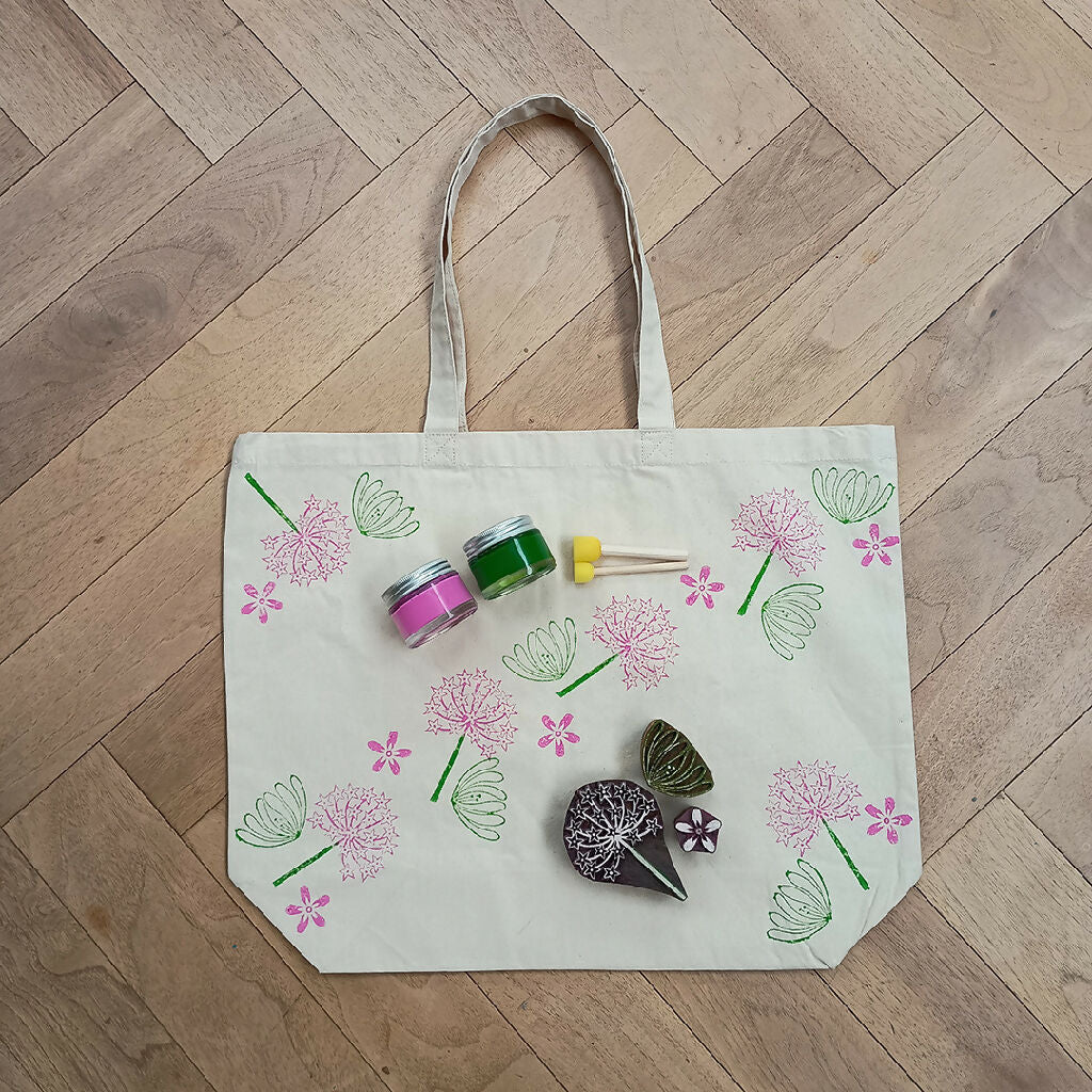 Wood block printing is a fun and relaxing textile craft with origins in India. With this kit, you will learn how to combine blocks to make a pattern and produce a beautiful hand-printed cotton bag. This is not a regular tote bag, it has a gusset which means it can fit loads in. Great for shopping or as a beach bag.