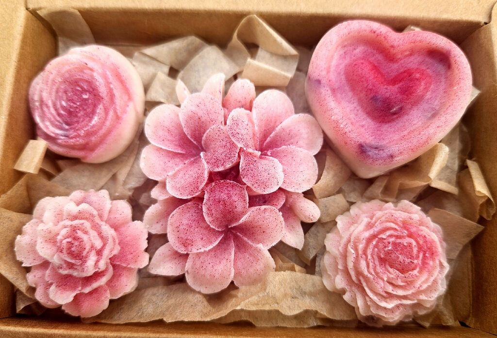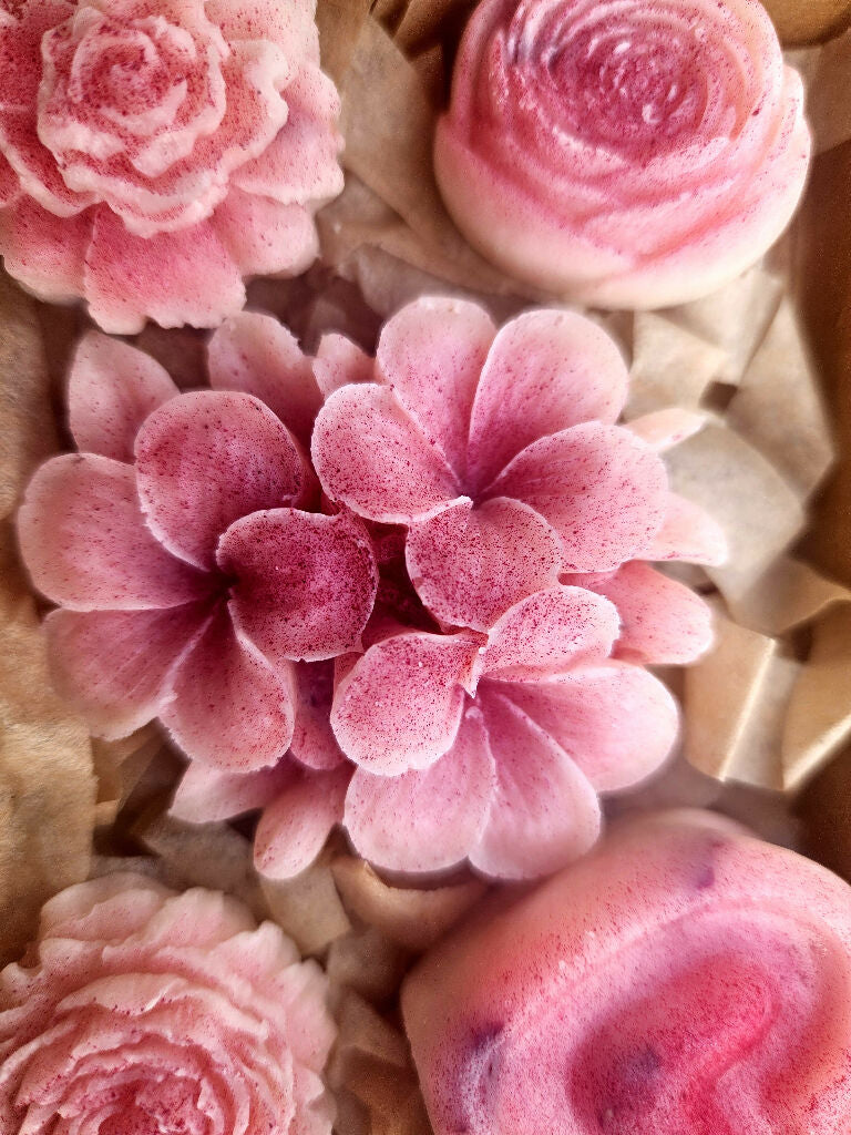 Naturally coloured with beetroot powder for a soft blush tone and finished with real dried rose petals, these melts are beautiful as they are indulgent- a perfect Mother's Day gift or self-care treat.