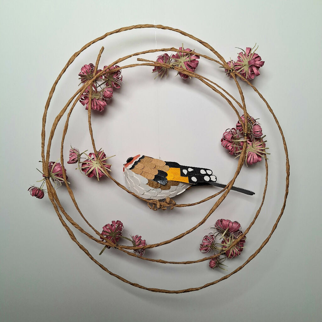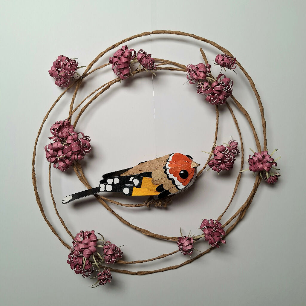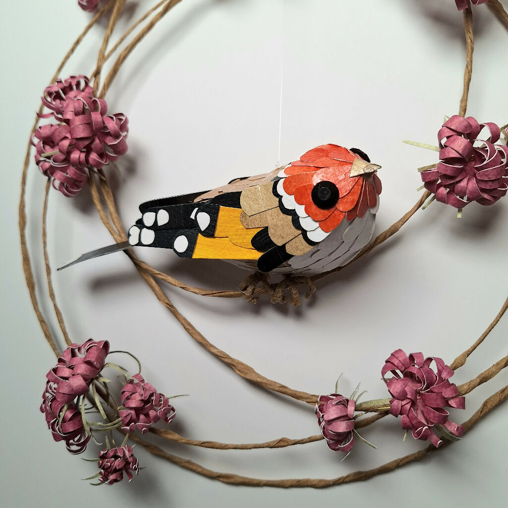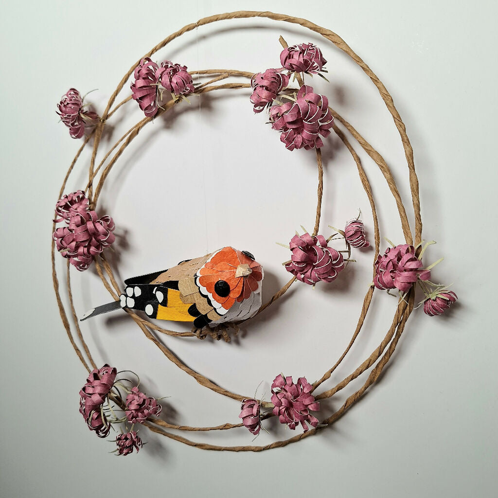 This spring flow3r wreath features a Eurasian Goldfinch, with his signature red crown, yellow gold and black spotted with feathers and golden back. He is accompanied by burgundy flower blossoms on his wreath. This paper sculpture is one of a kind.