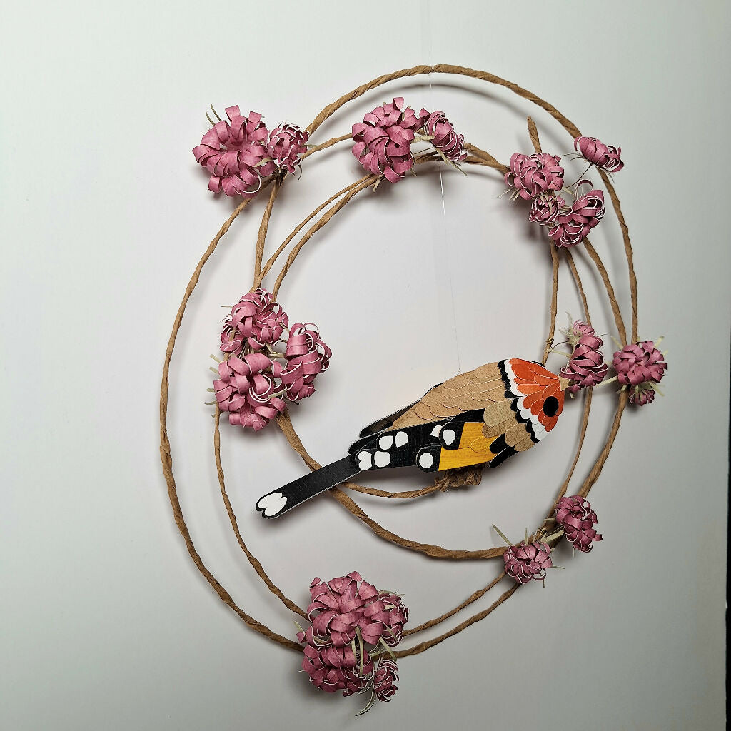 This hanging wall sculpture attaches to the wall via a steel hook, which is suspended with invisible fishing line from the top of the wreath at a length of 30 cm.