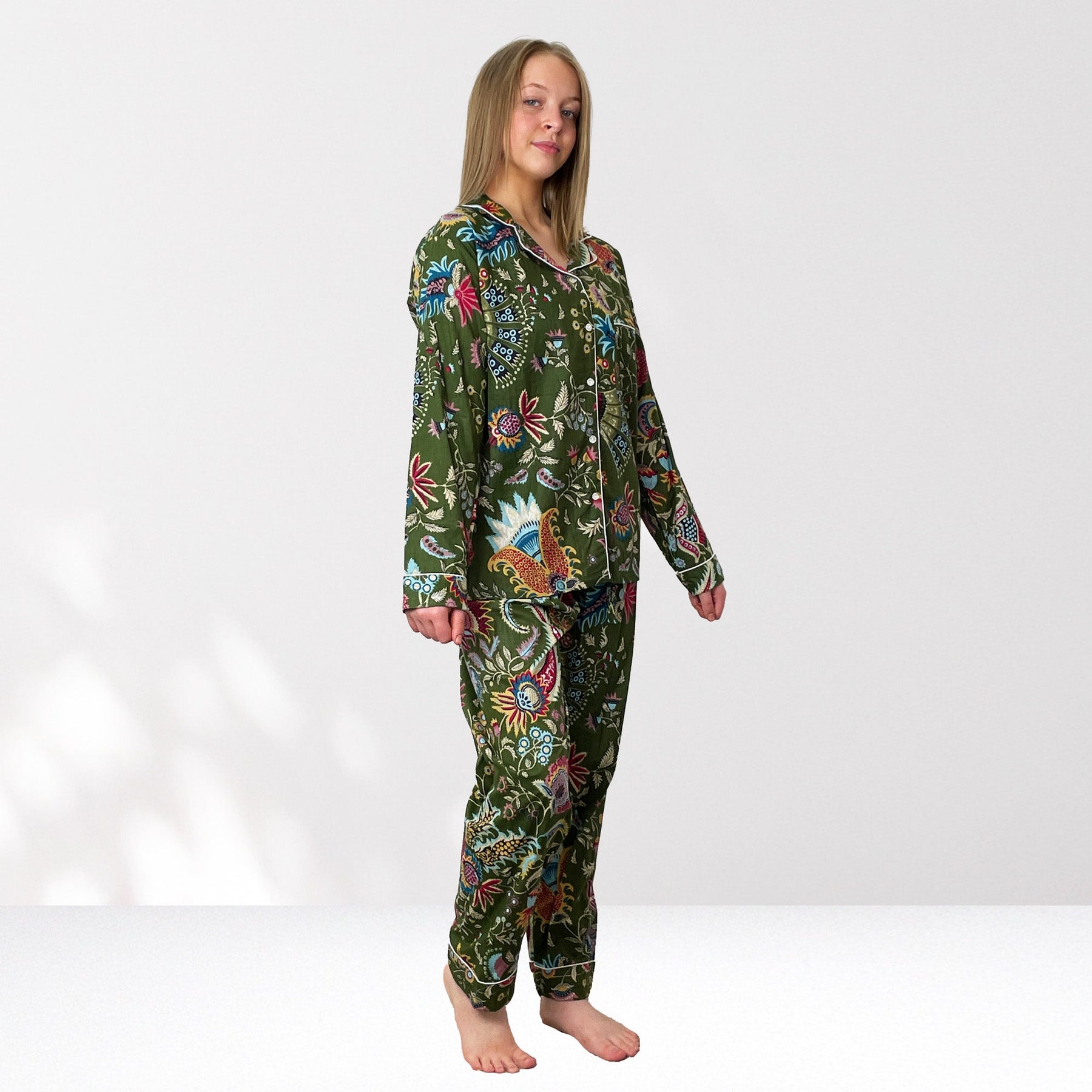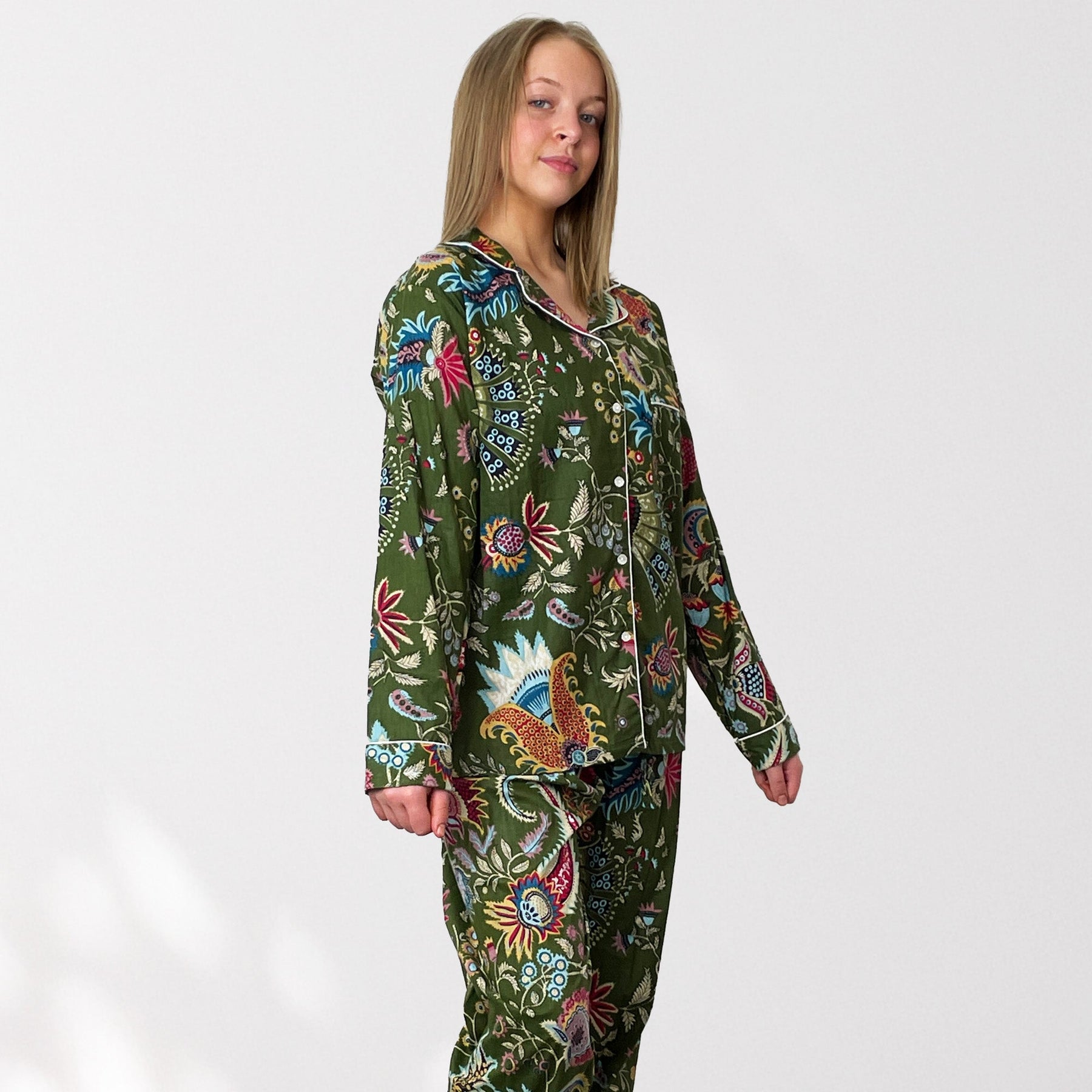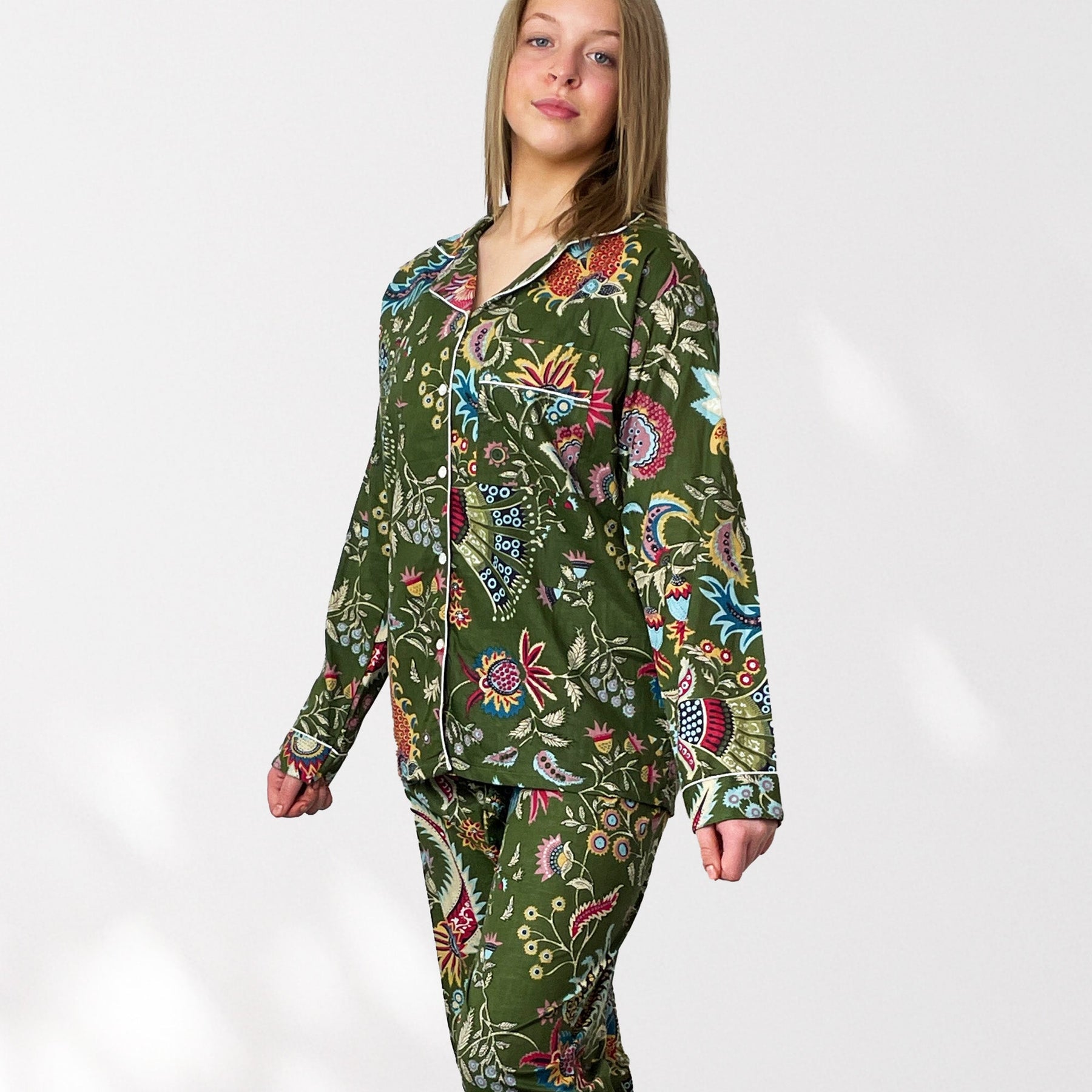 Indulge in our exquisite 100% Cotton Pyjama Set featuring a beauiful floral style print on an Olive Green background with highlights of Pink, bright blues and Yellows.