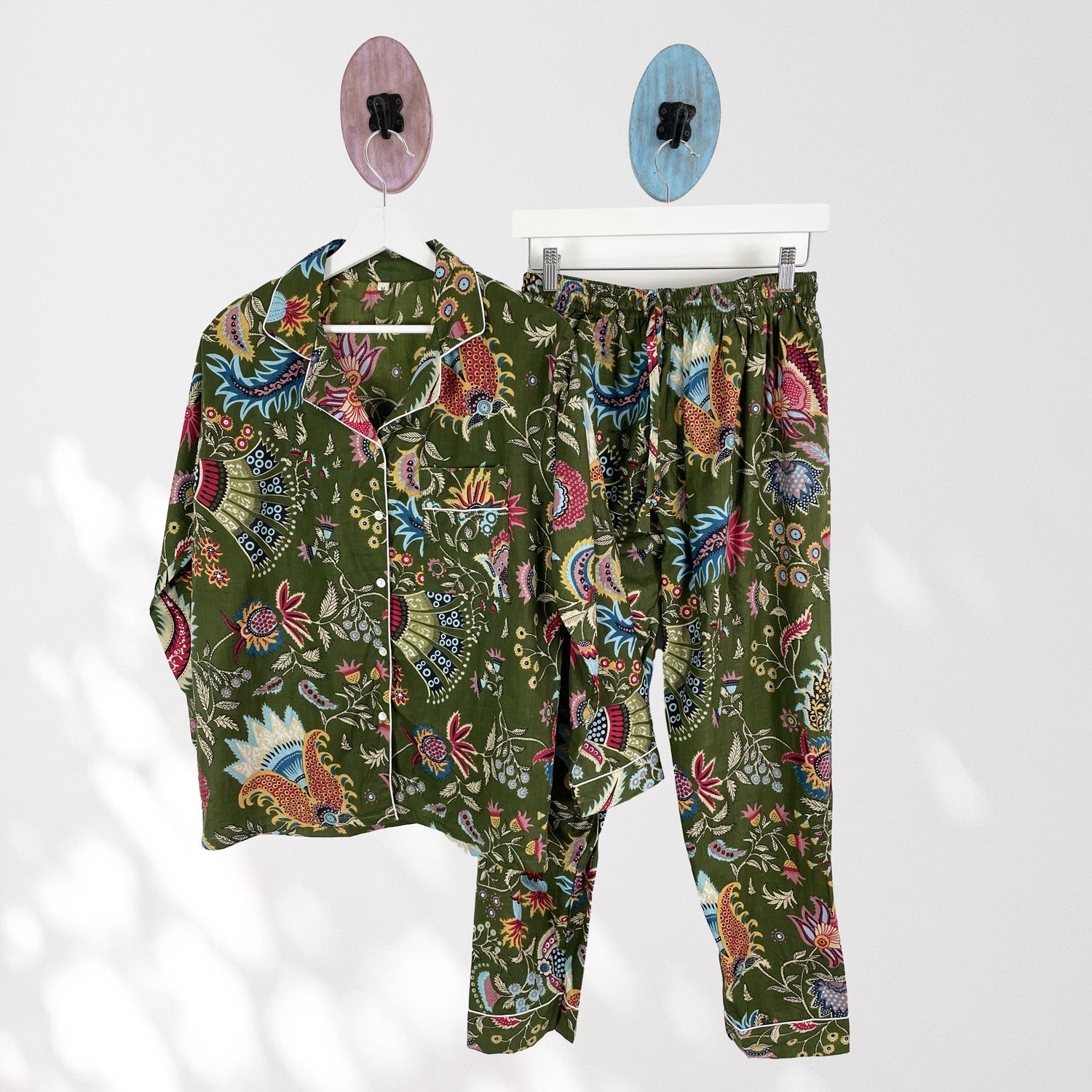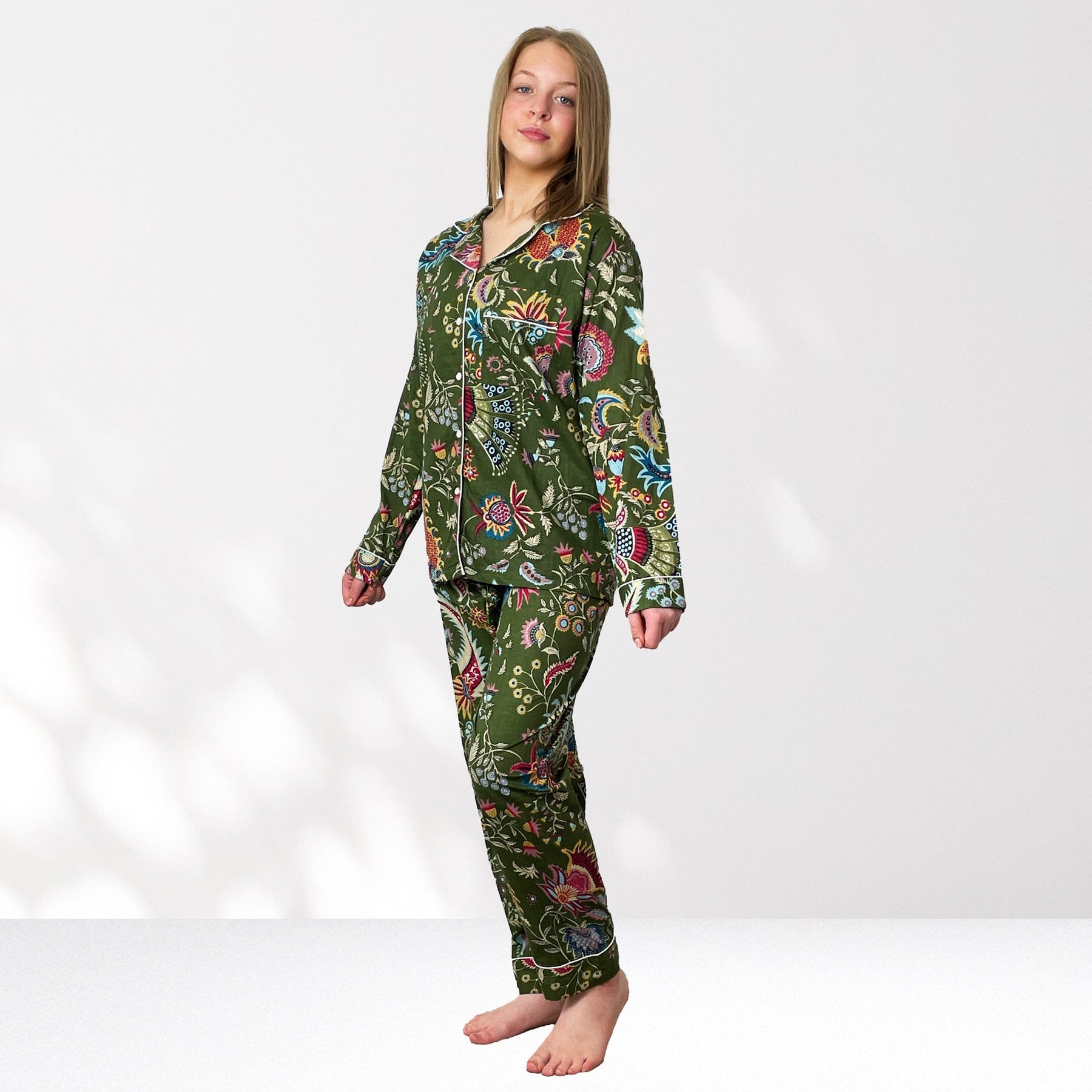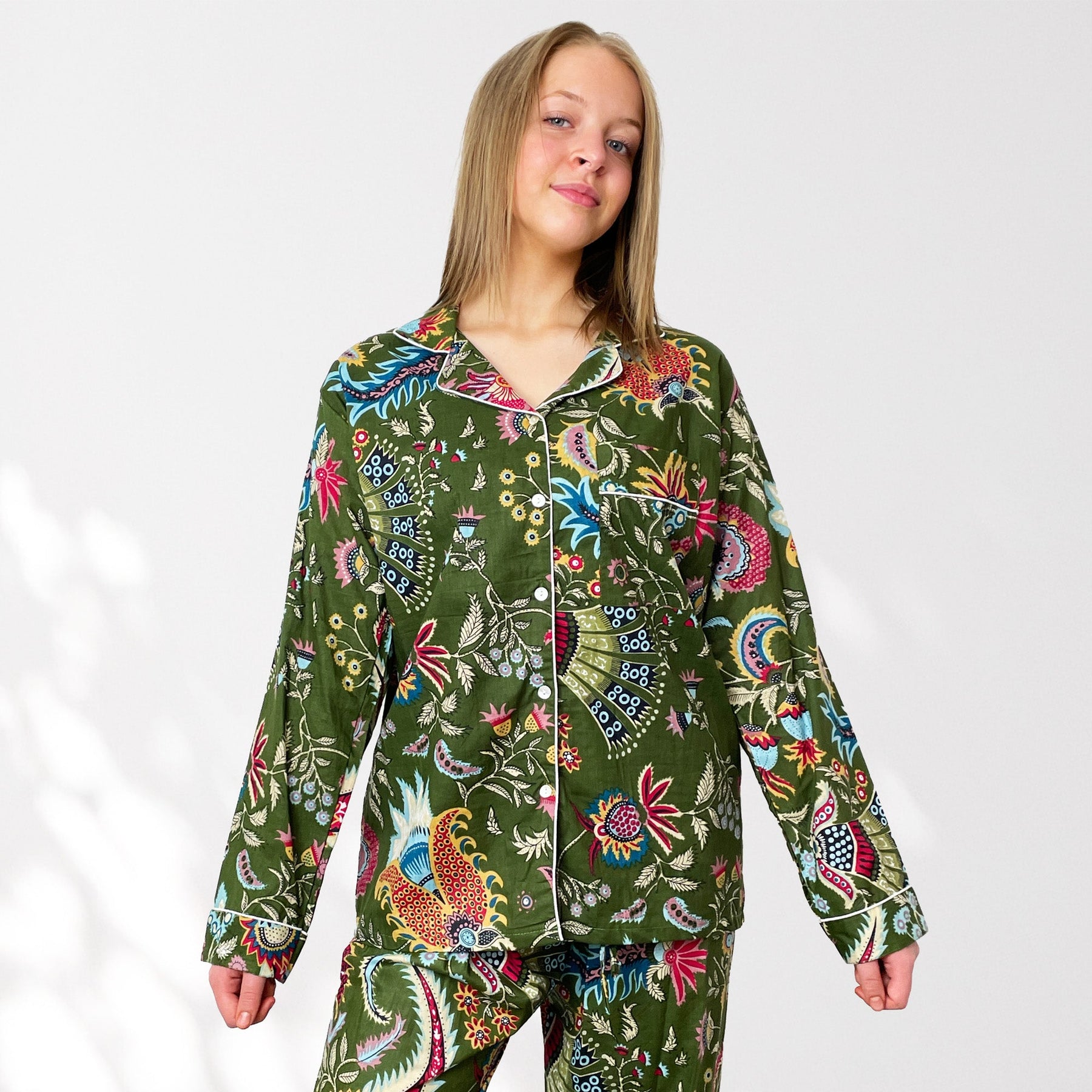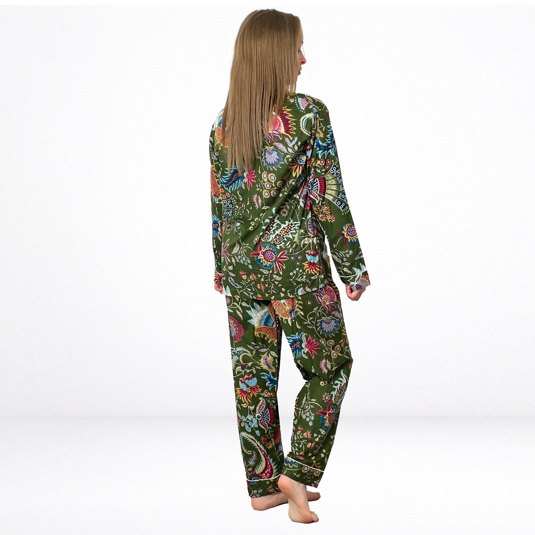 Indulge in our exquisite 100% Cotton Pyjama Set featuring a beauiful floral style print on an Olive Green background with highlights of Pink, bright blues and Yellows.