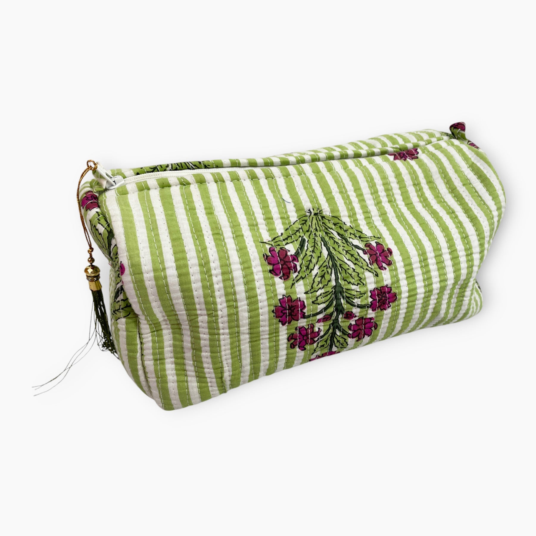 This cute block print green stripe and pink garden flower print quilted washbag features a fully waterproof lining and internal pockets,makes the perfect gift for a gardener.