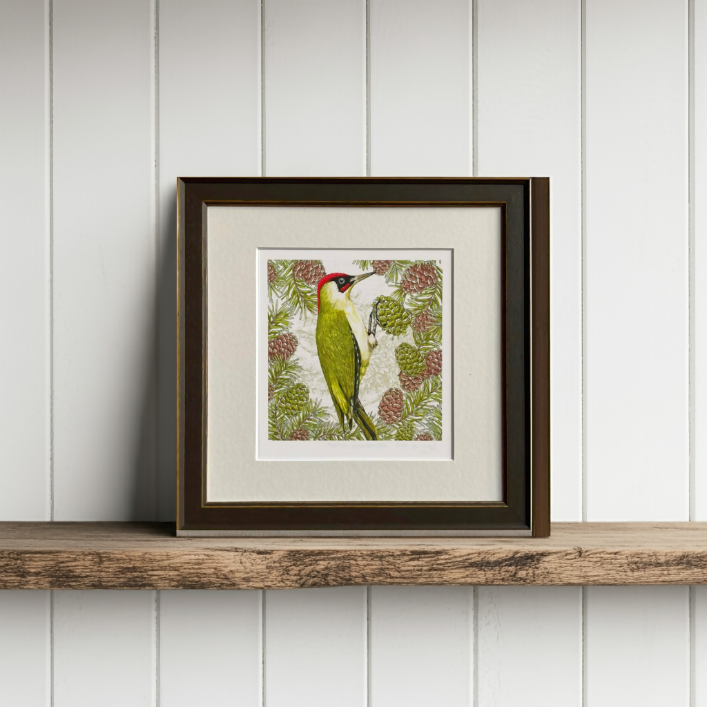 Inspired by the beauty of the British Countryside this hand-drawn print with an etched feel depicts a Green woodpecker amongst pine cones.