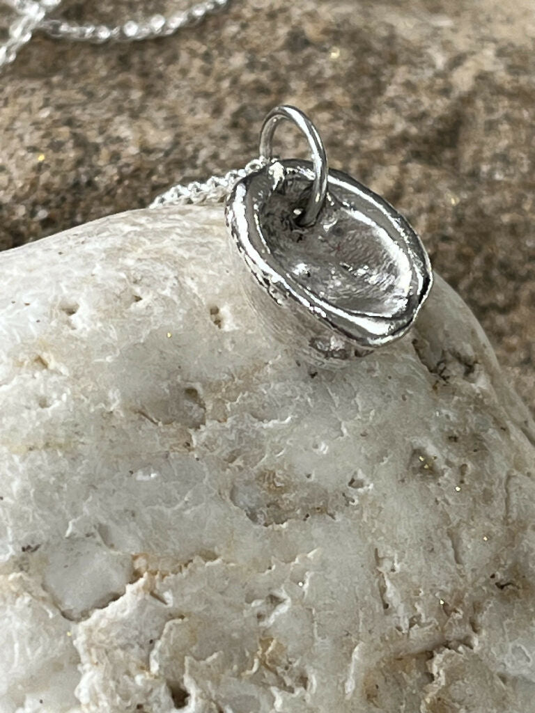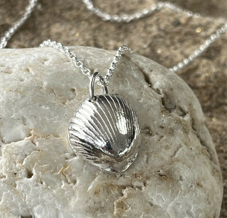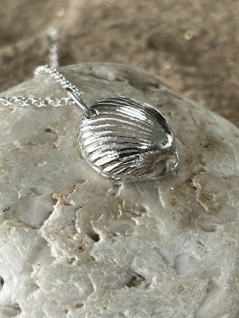 A unique .999 fine silver beautiful cockle shell pendant, hand cast from a natural shell from Westward Ho! beach in North Devon.