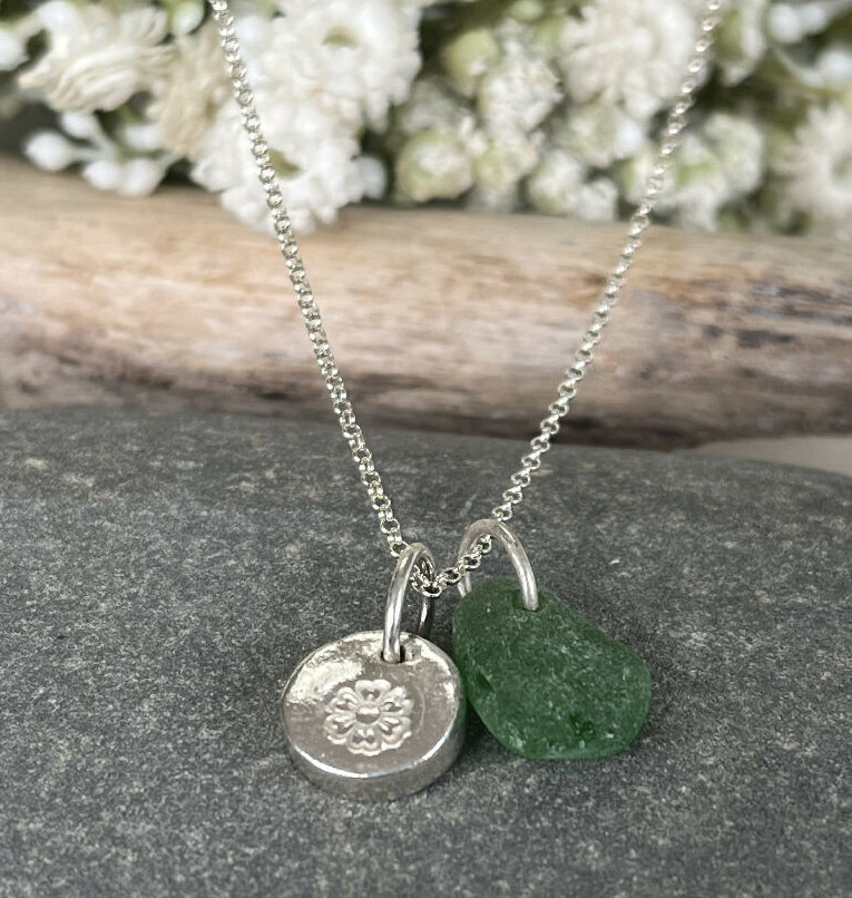 A piece of green Devon sea glass, collected by myself from a North Devon beach completes the necklace.