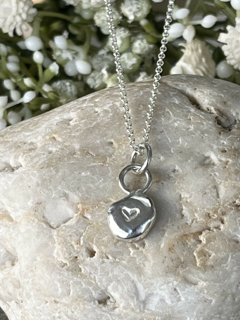 A unique handmade organic shaped recycled fine silver pebble pendant, hand stamped with a heart.