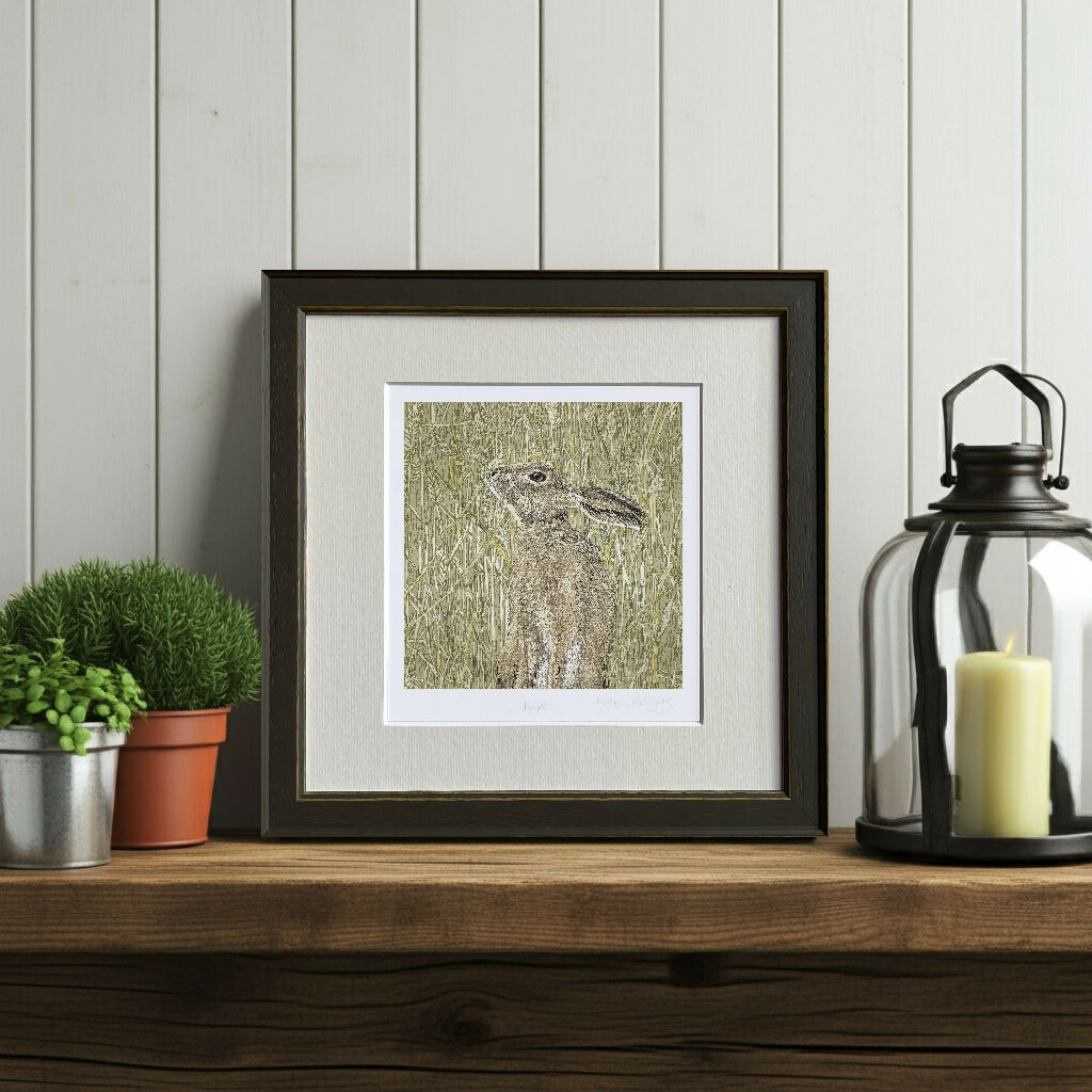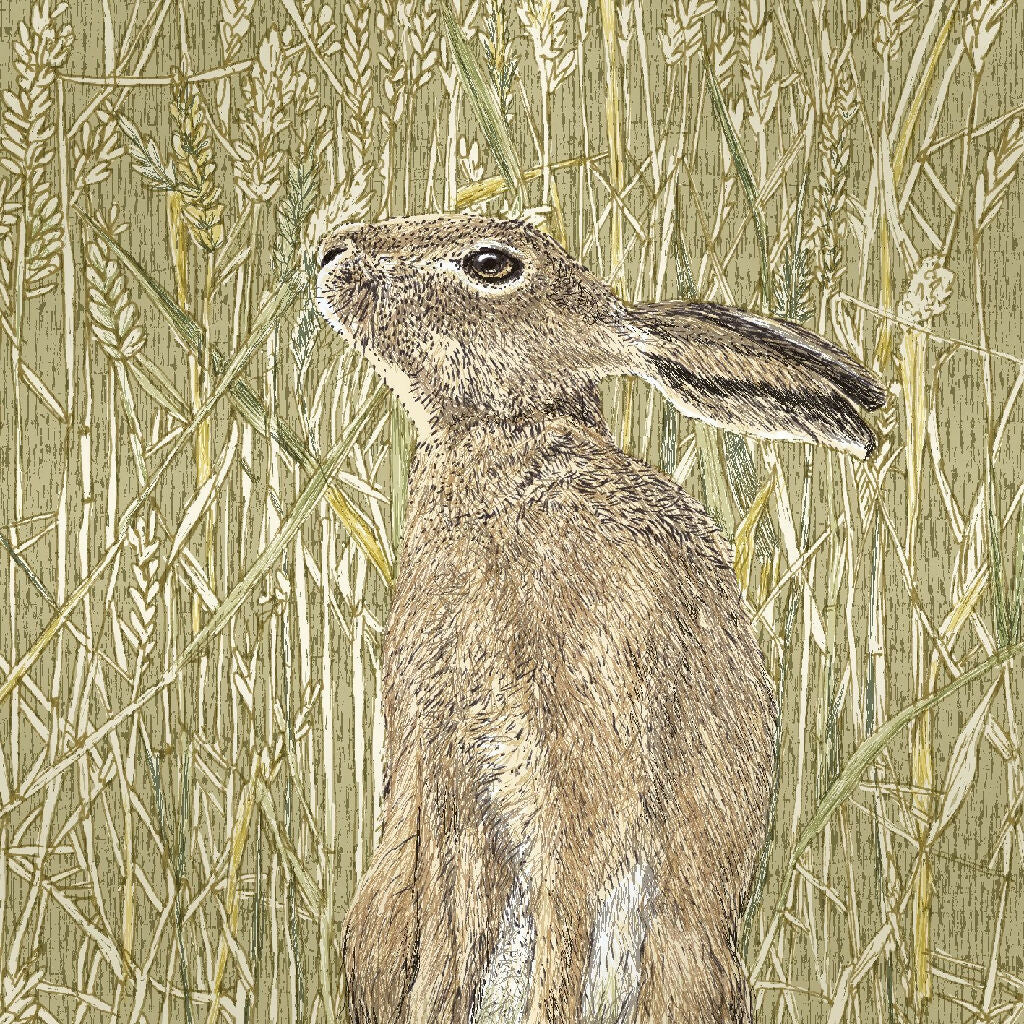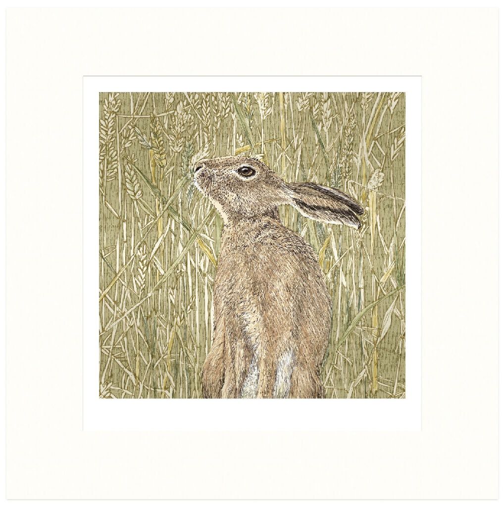 Inspired by the beauty of the British Countryside this hand-drawn print with an etched feel depicts a Harvest Hare in wheat fields.
