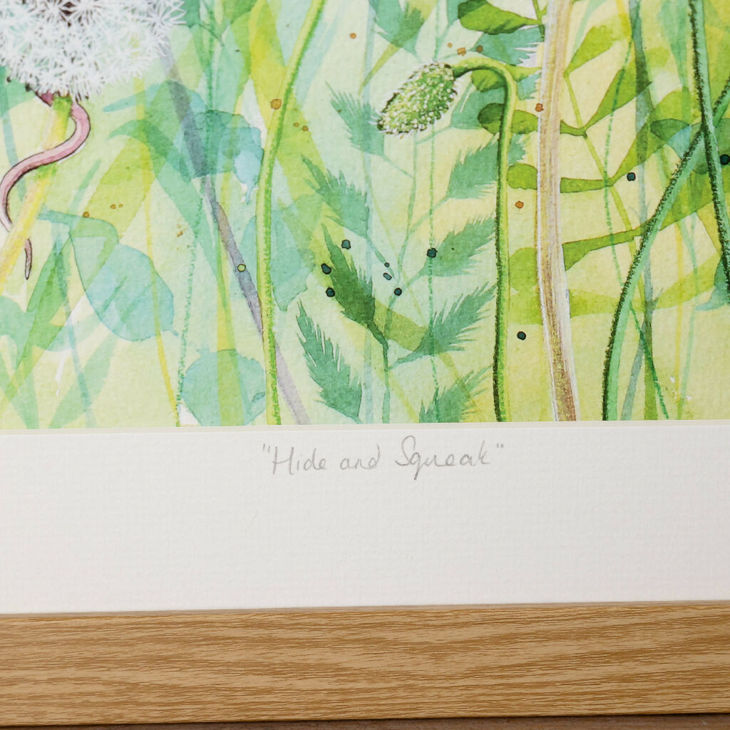 This charming and colourful harvest mice print comes from an original ink and watercolour painting by Jina Gelder. Jina captured the playful nature of harvest mice, climbing around in a poppy field. Titled 'Hide and Squeak' this limited edition giclée print would bring a splash of colour to your home as well as making you smile with its sense of humour.