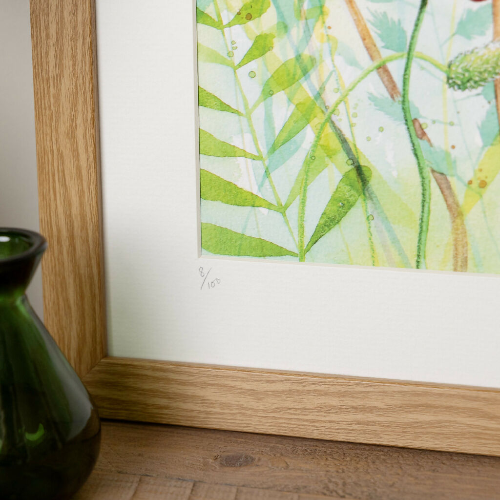 All of Jina's limited edition prints are printed onto archival textured paper to best mimic the original watercolour painting. Using the highest quality inks these giclée prints are limited editions of 100 and come mounted as standard. You can order this print in 2 sizes with framing optional. Due to difficulties posting larger frames A2 prints are only available mounted.