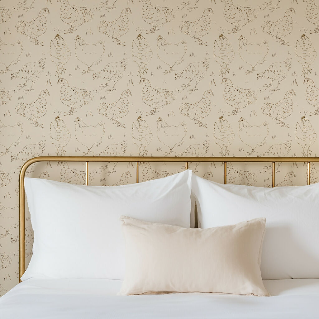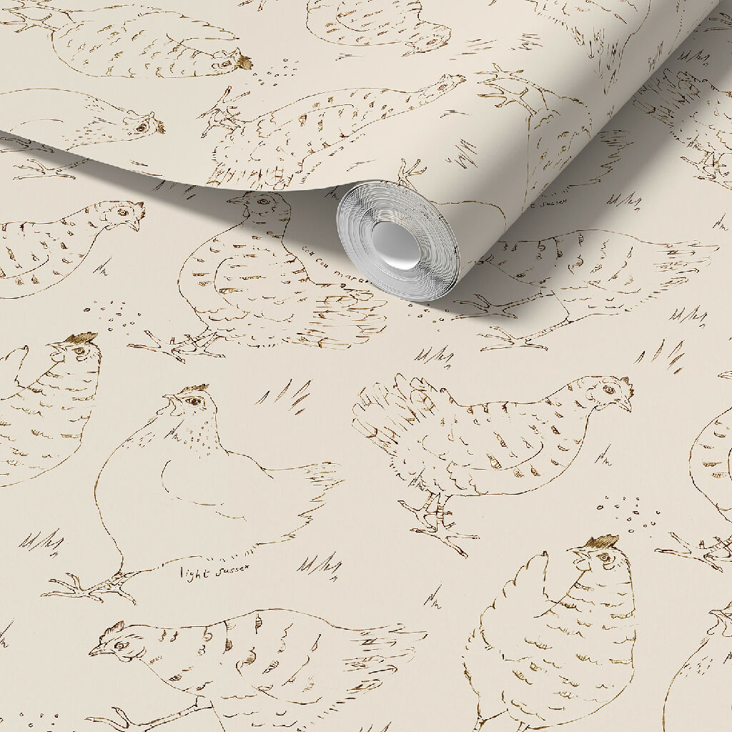 This charming sustainable hen wallpaper features a hand-drawn design set against a soft oatmeal background, making it an ideal choice for a country home. The intricate illustrations of hens, each uniquely detailed, evoke a sense of rustic charm and warmth, perfectly complementing the natural aesthetics of farmhouse decor. Locally printed onto paper sourced from sustainably managed forests, this wallpaper not only enhances the visual appeal of any room but also aligns with sustainable living practices. Its neutral oatmeal hue provides a versatile backdrop that harmonises well with various colour schemes and furnishings, creating a cozy and inviting atmosphere that celebrates country life. This wallpaper is perfect for any space where you want to bring a touch of countryside elegance into your home.