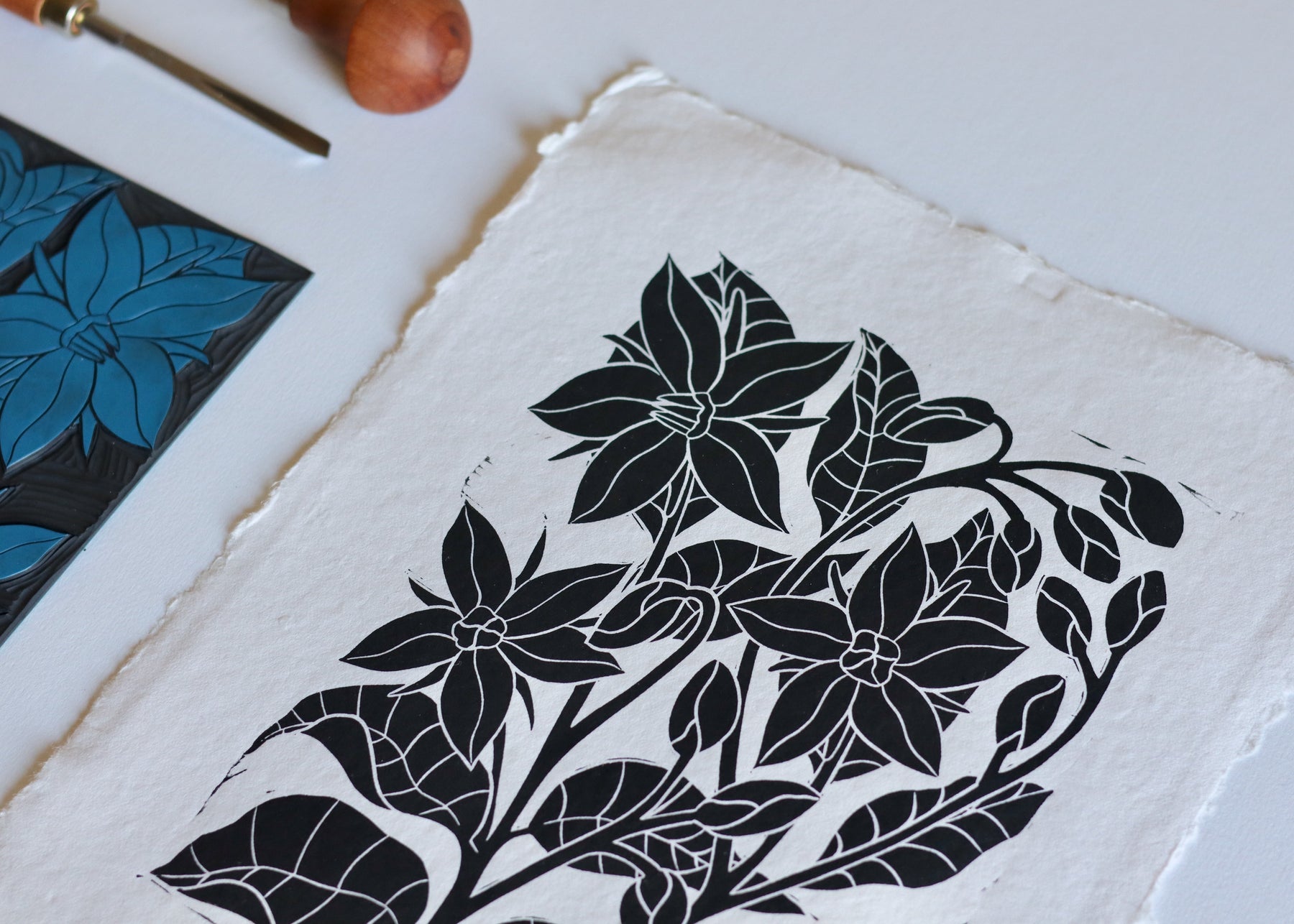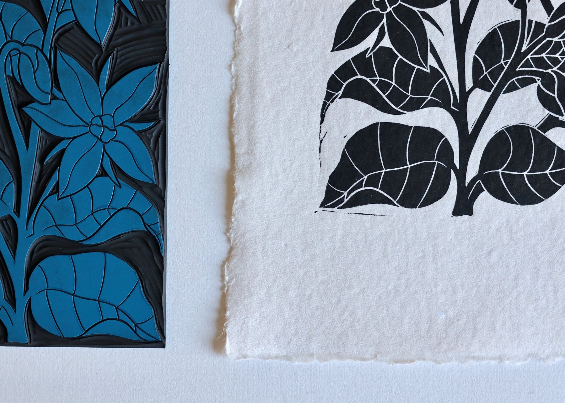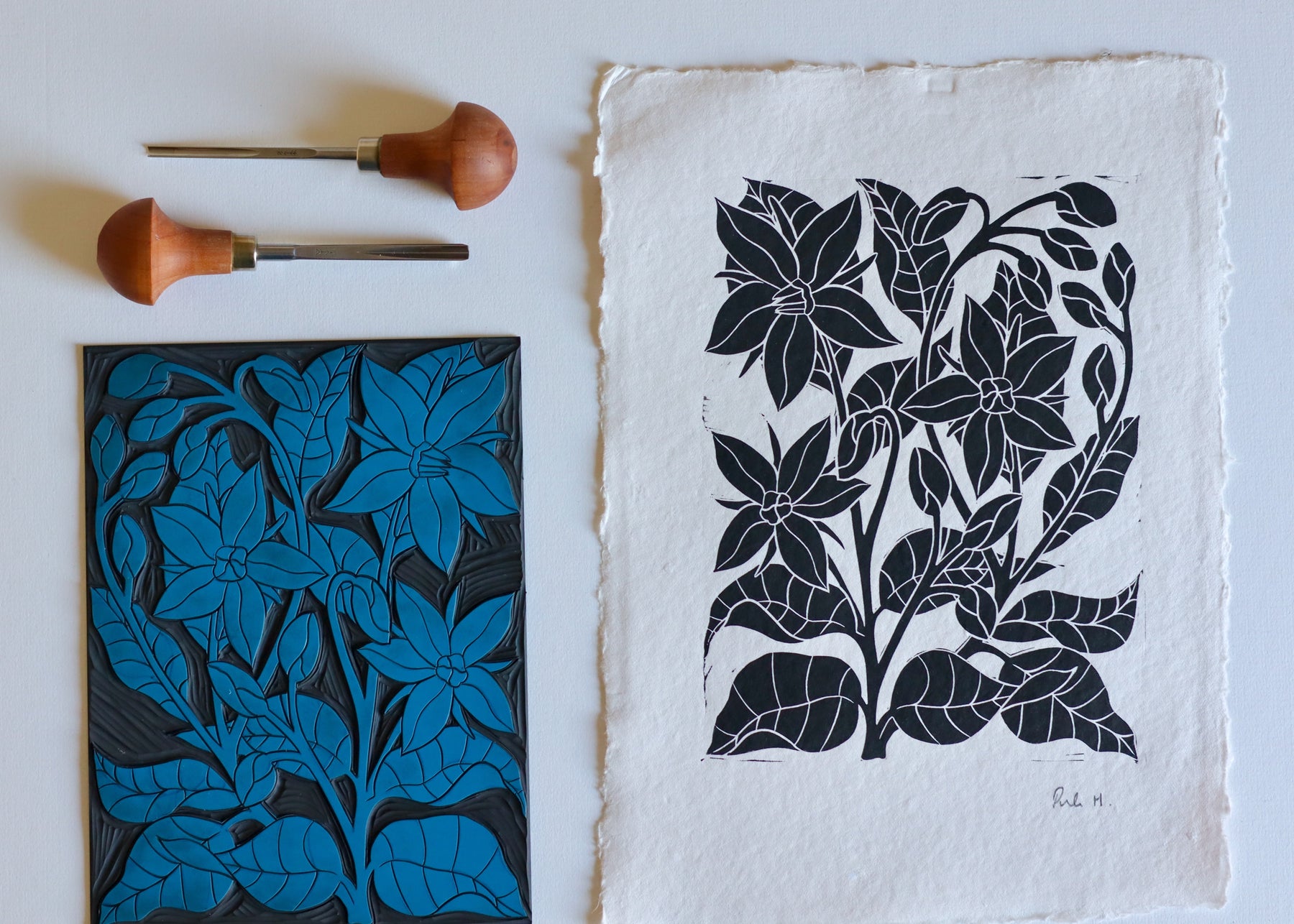 Hand printed on to handmade cotton rag paper, roughly A4 size but please expect slight variations due to the handmade nature of the paper.