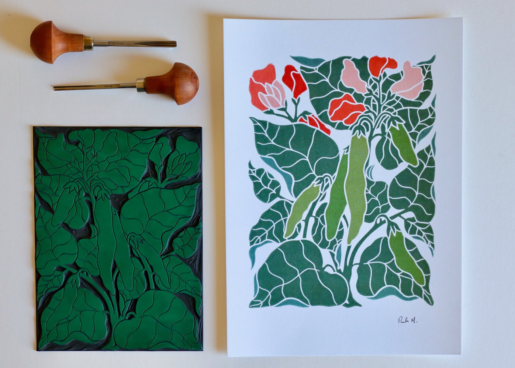 This vibrant linocut print celebrates the magnificent runner bean (Phaseolus coccineus), capturing both its ornamental beauty and practical value in the traditional British kitchen garden.