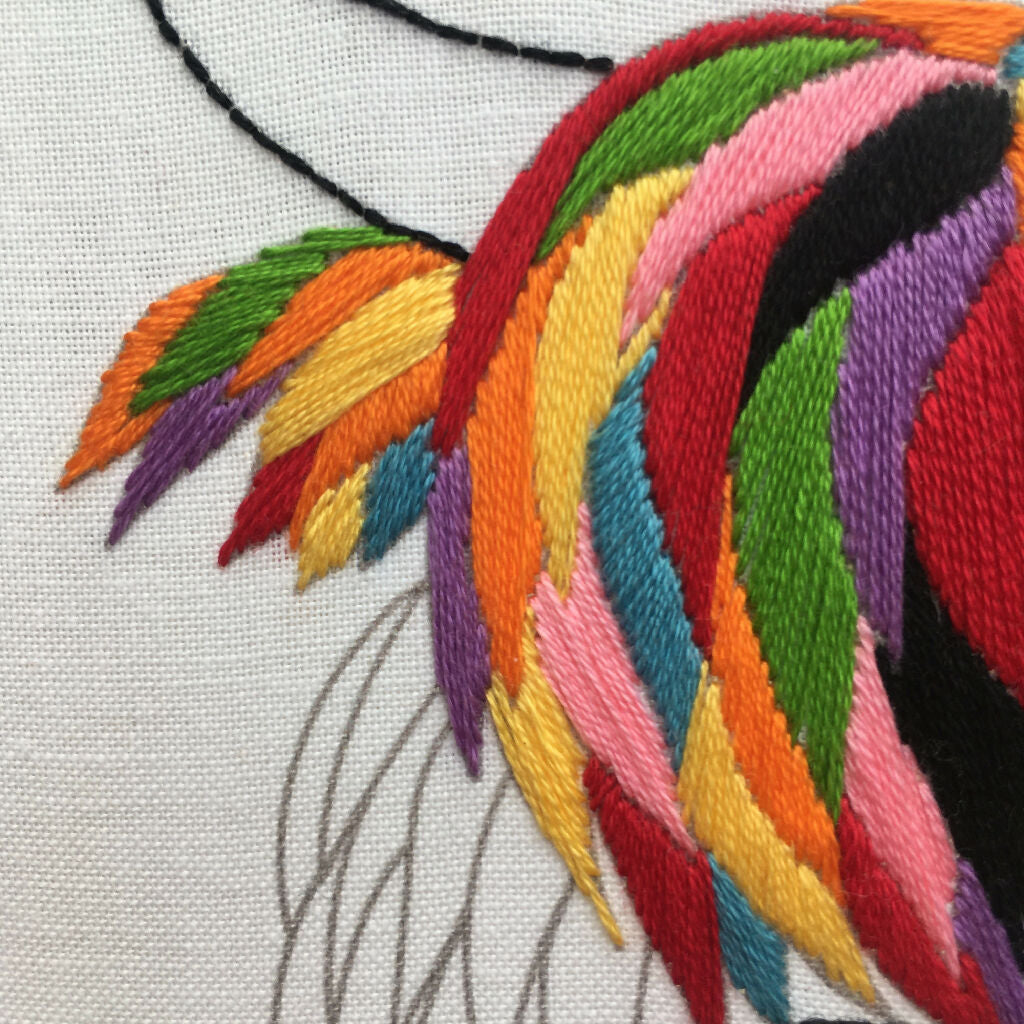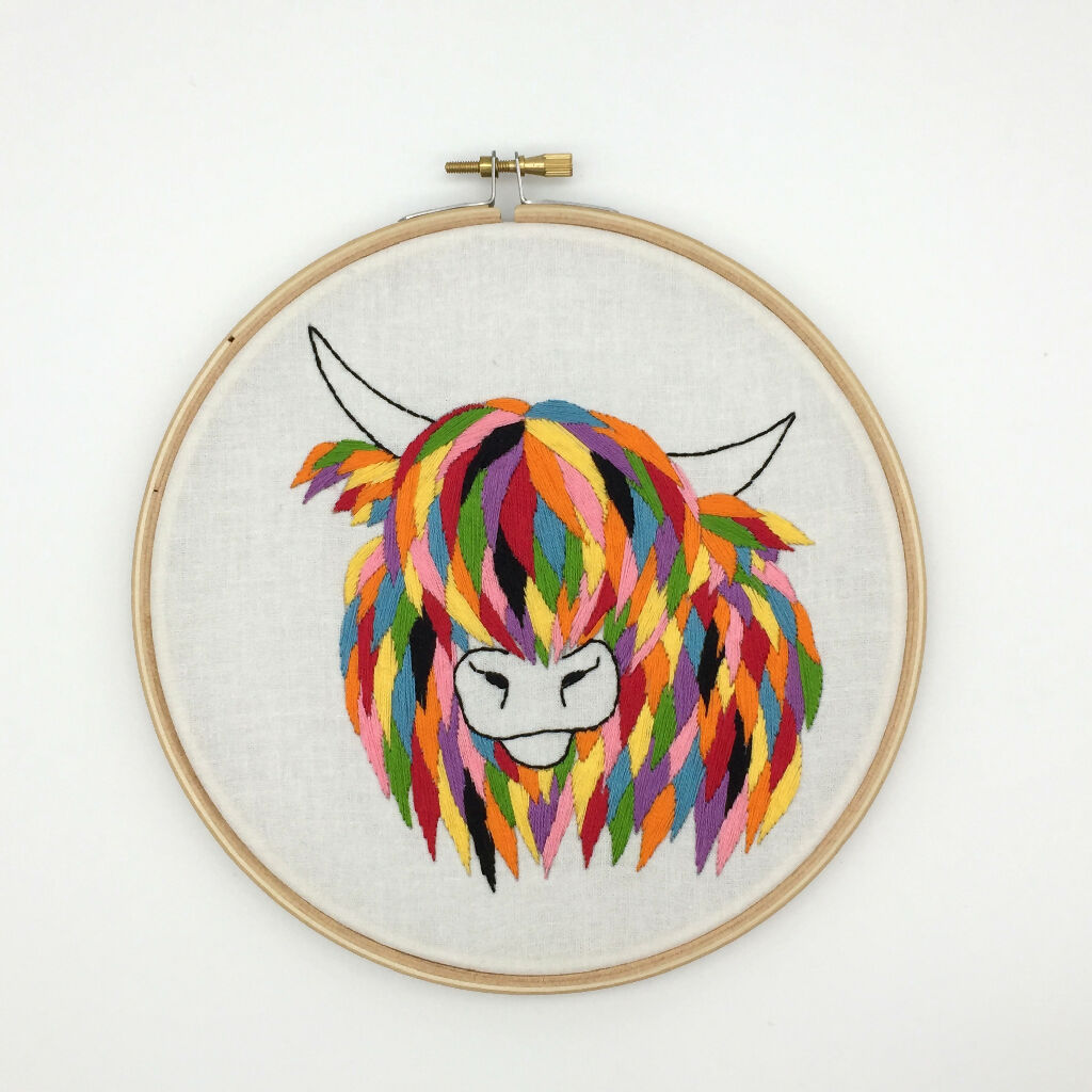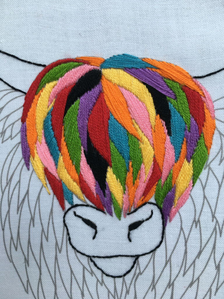 Apart from a small amount of backstitch for the horns and nose, this stunning embroidery is completed using satin stitch, giving an amazing depth to the colours and creating the lovely shaggy look of the iconic highland cow.