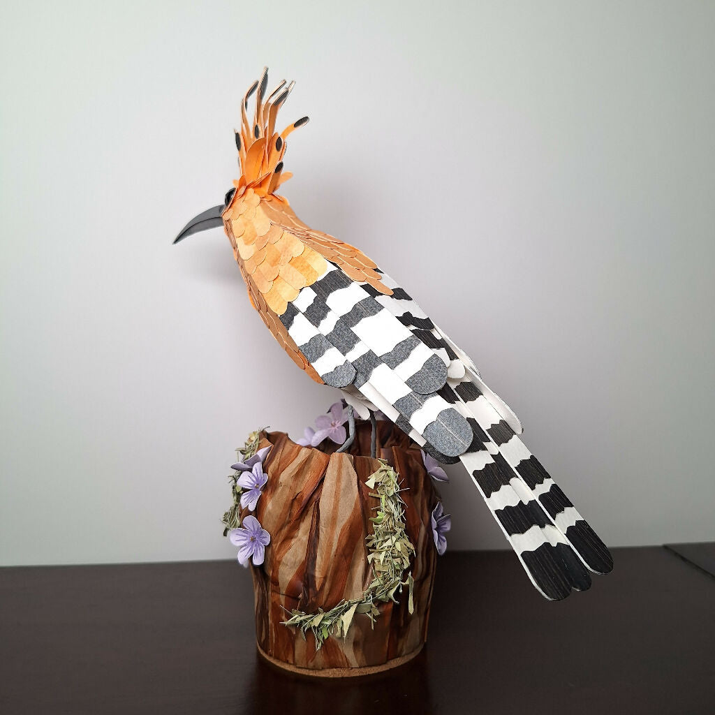 The hoopoe has a peach head and belly, with a spotted crest and zebra black and white striped wing and back feathers. He is made entirely from hand printed papers and is one of a kind.