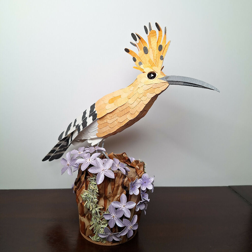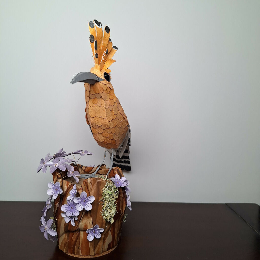 This handmade bird sculpture features a hoopoe perched on a tree stump adorned with moss and pale purple flowers.