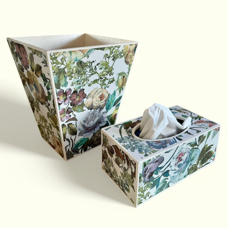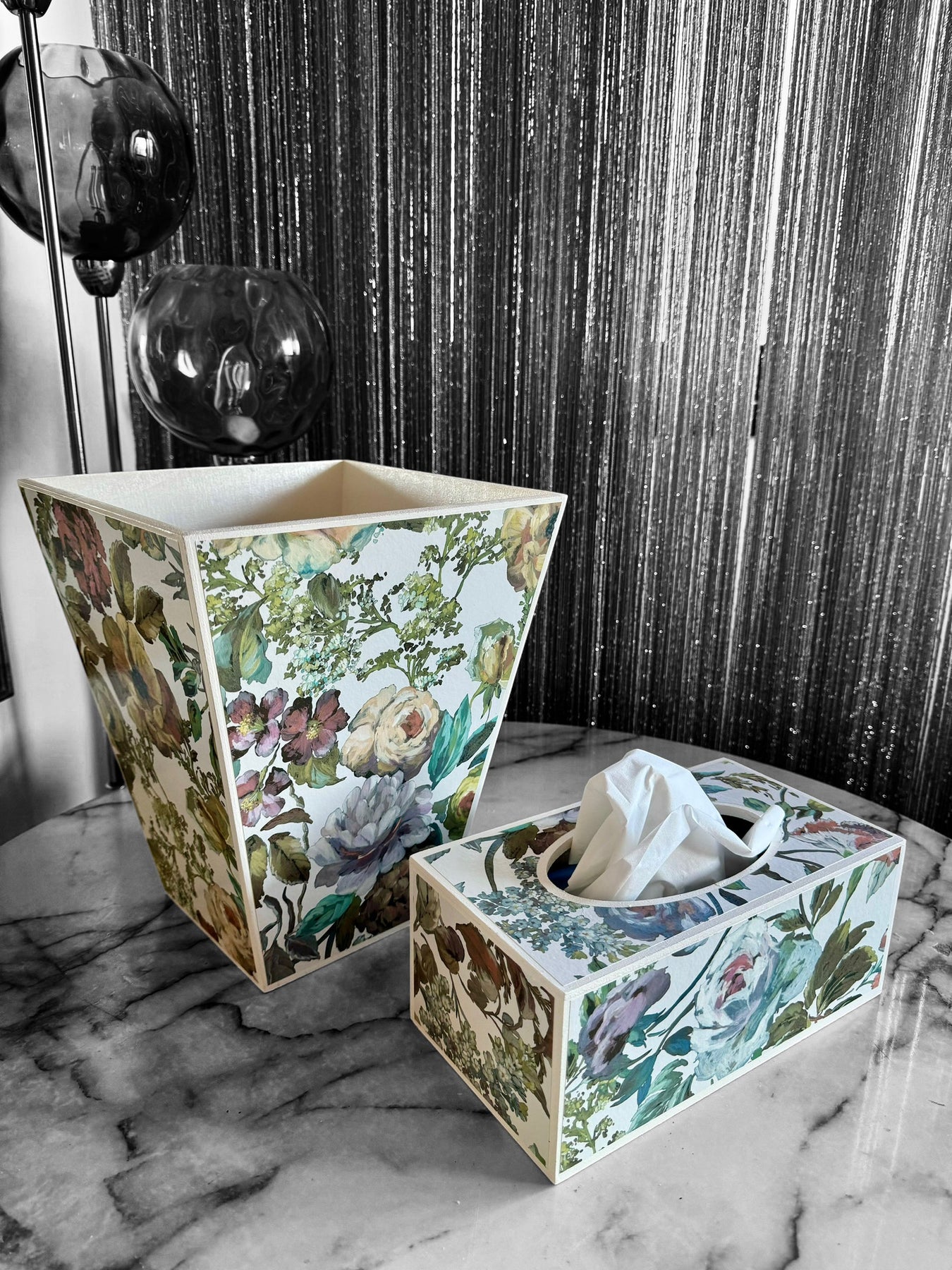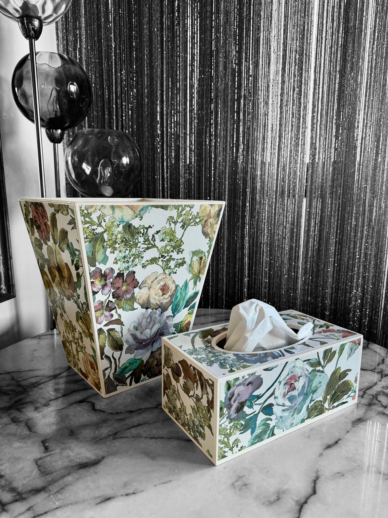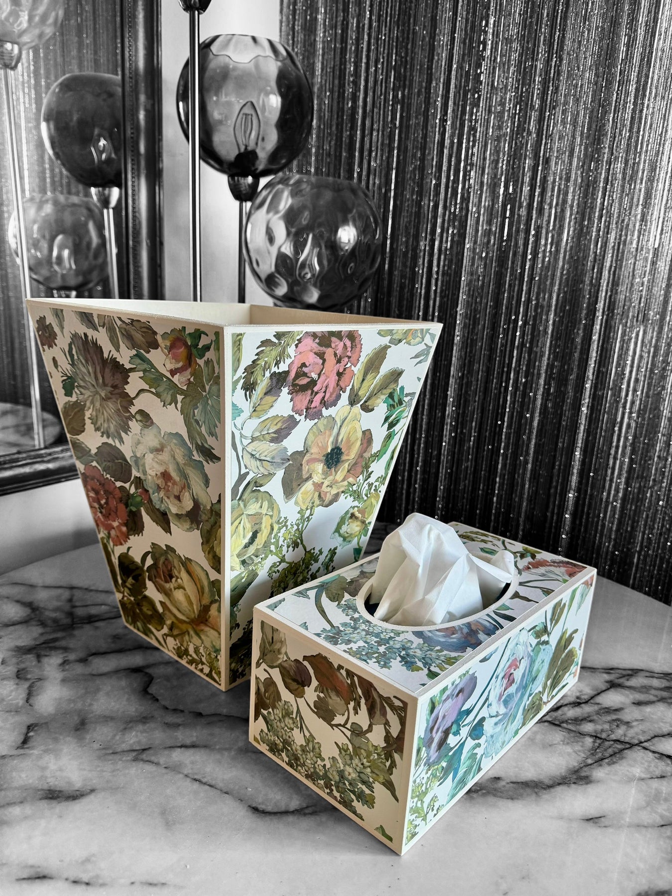 You add understated elegance with this luxury handmade bin and tissue box set, featuring Mansur by Designers Guild in chic zinc. Hand-painted off-white trim, satin-sealed craftsmanship, and soft florals create a versatile, timeless design for bedrooms, bathrooms, or living spaces.