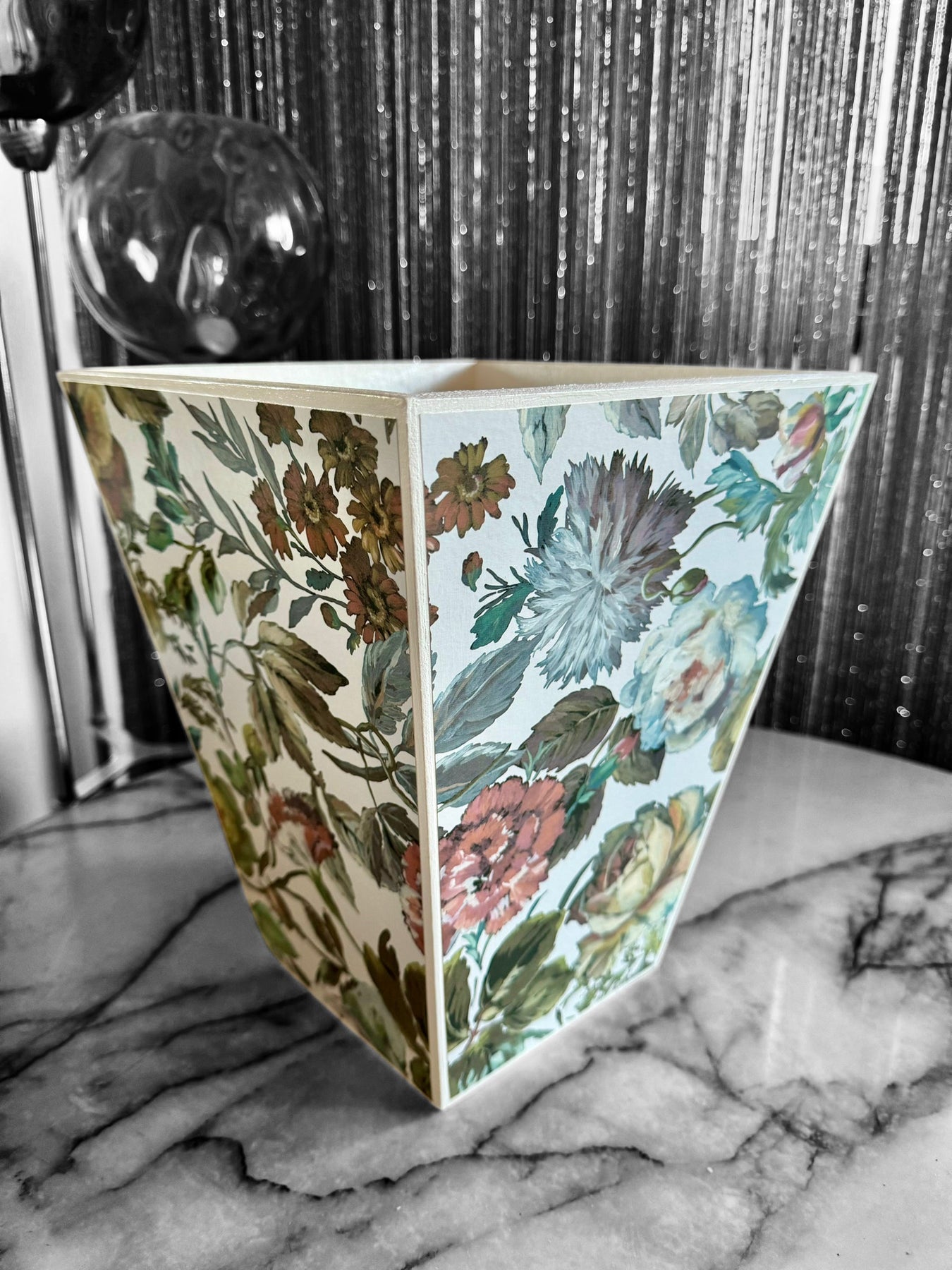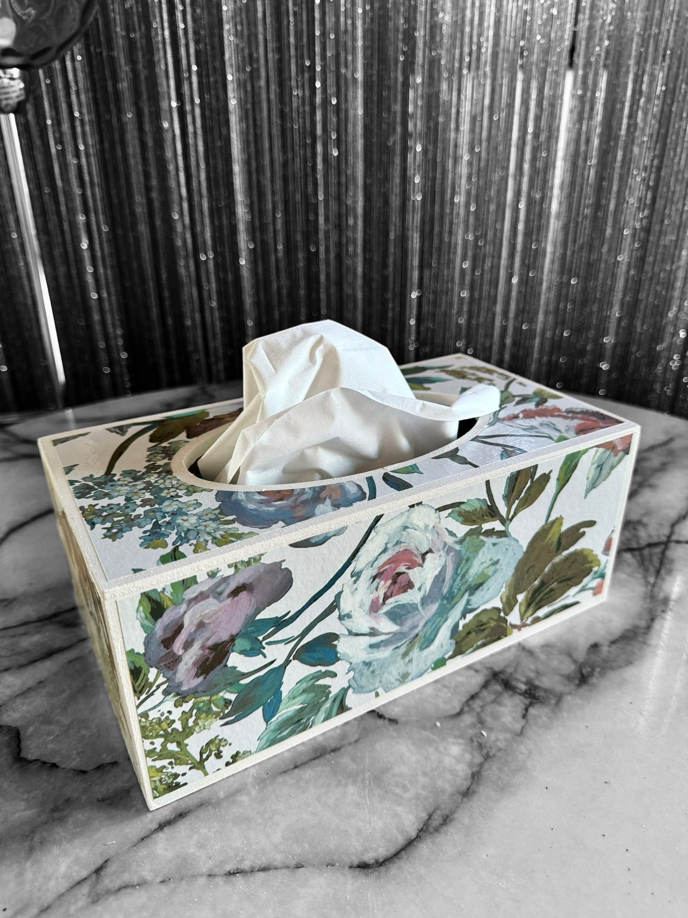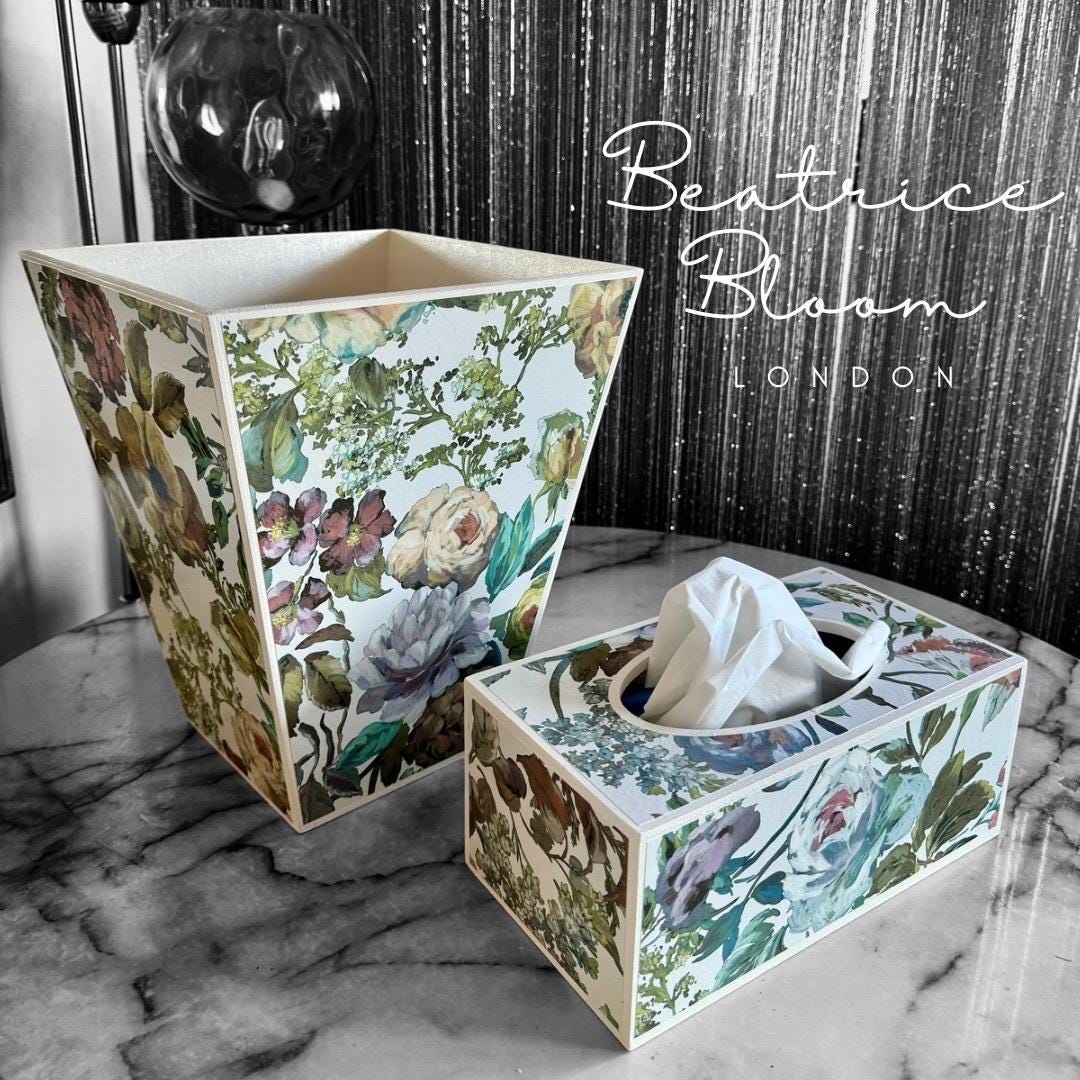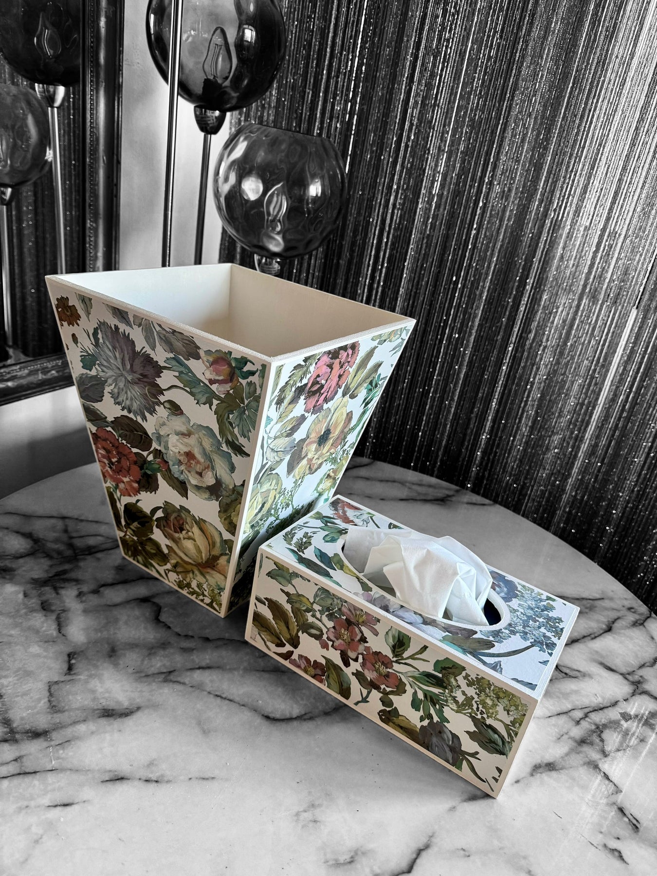You add understated elegance with this luxury handmade bin and tissue box set, featuring Mansur by Designers Guild in chic zinc. Hand-painted off-white trim, satin-sealed craftsmanship, and soft florals create a versatile, timeless design for bedrooms, bathrooms, or living spaces.