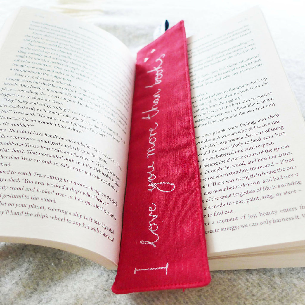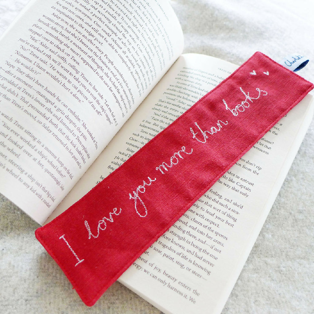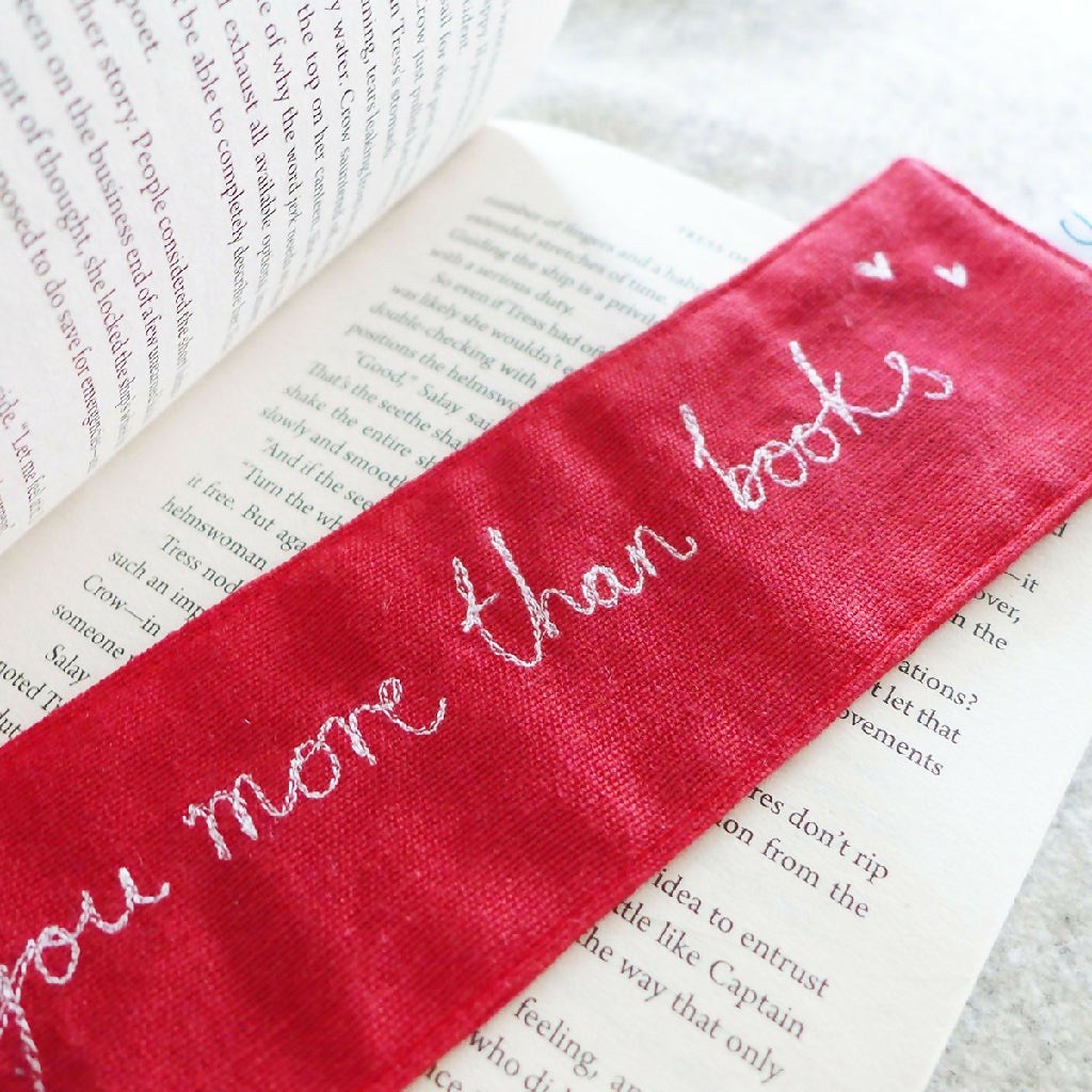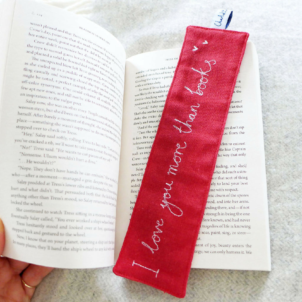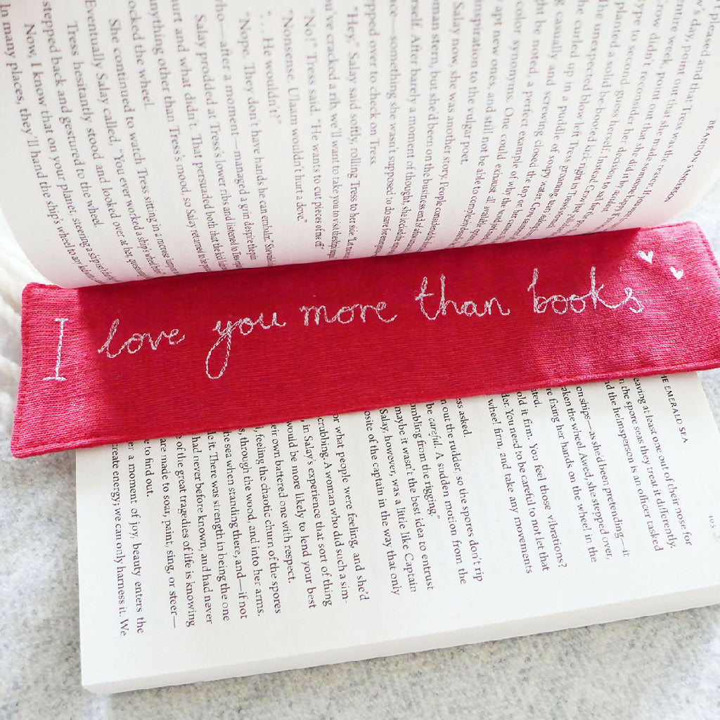 A classic red cotton bookmark with embroidered 'I love you more than books' handwriting and perfect for a Valentine's Day gift.