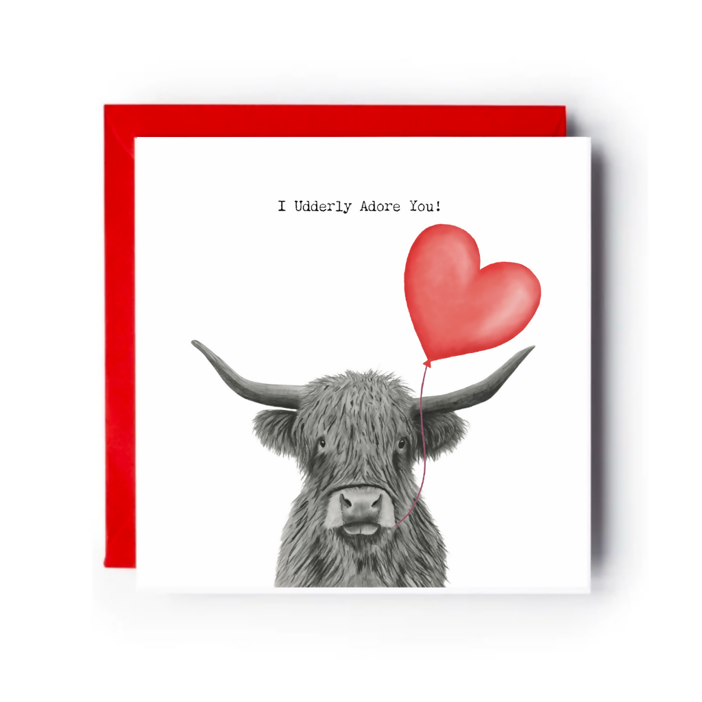 Make them smile and melt their heart with this adorable “I Udderly Adore You” Highland coo card. Featuring a fluffy Highland cow holding a heart-shaped balloon, this card is the perfect mix of cute, funny, and heartfelt.