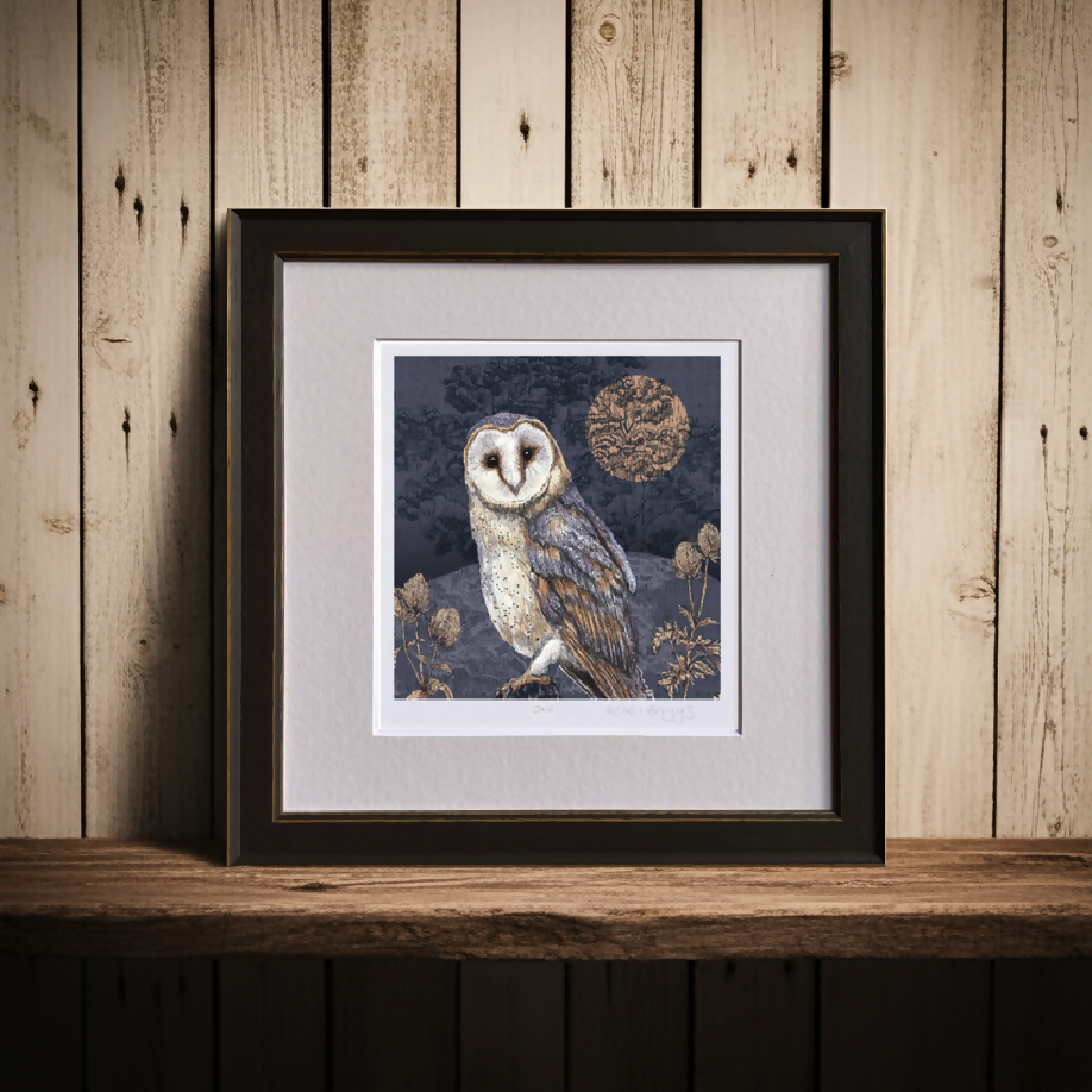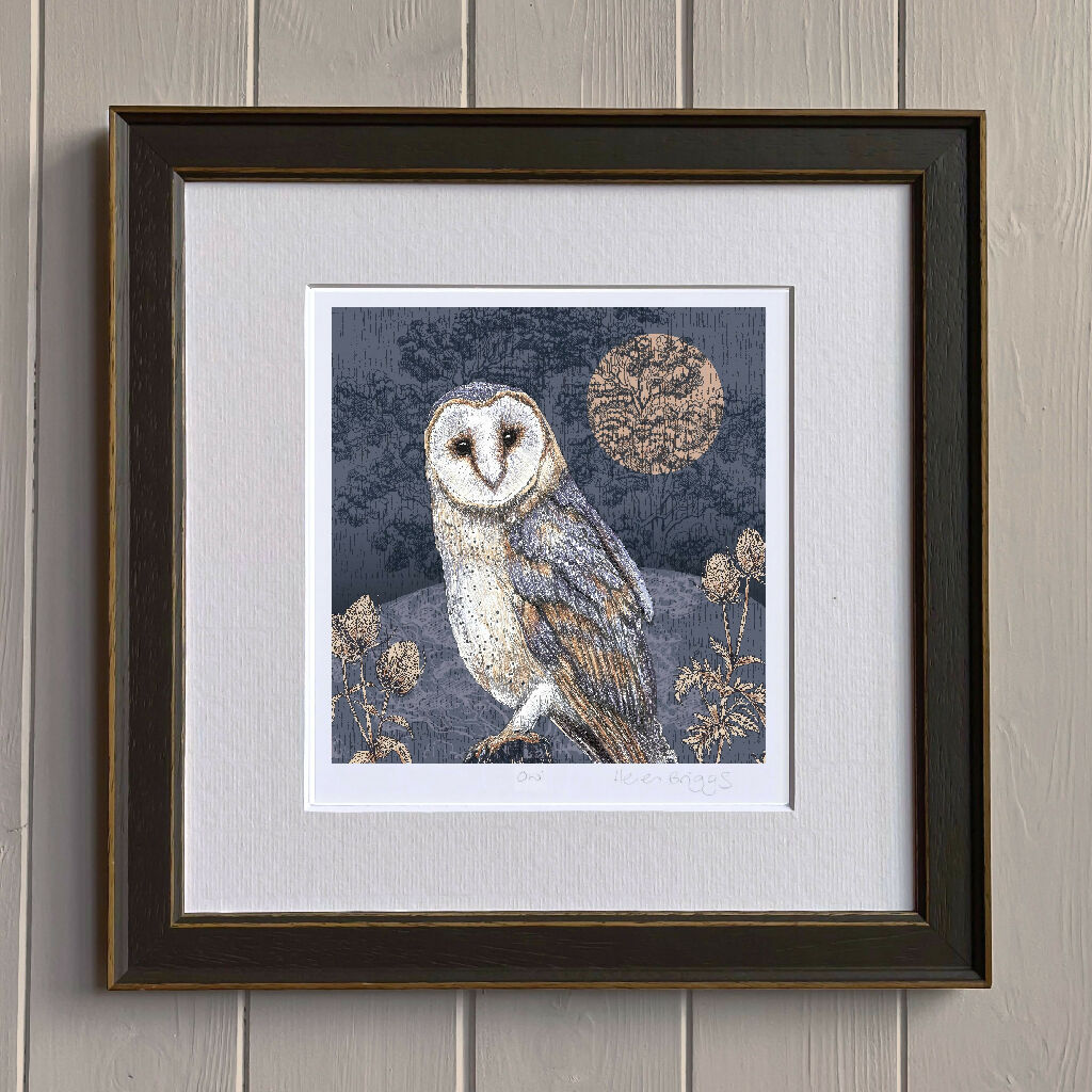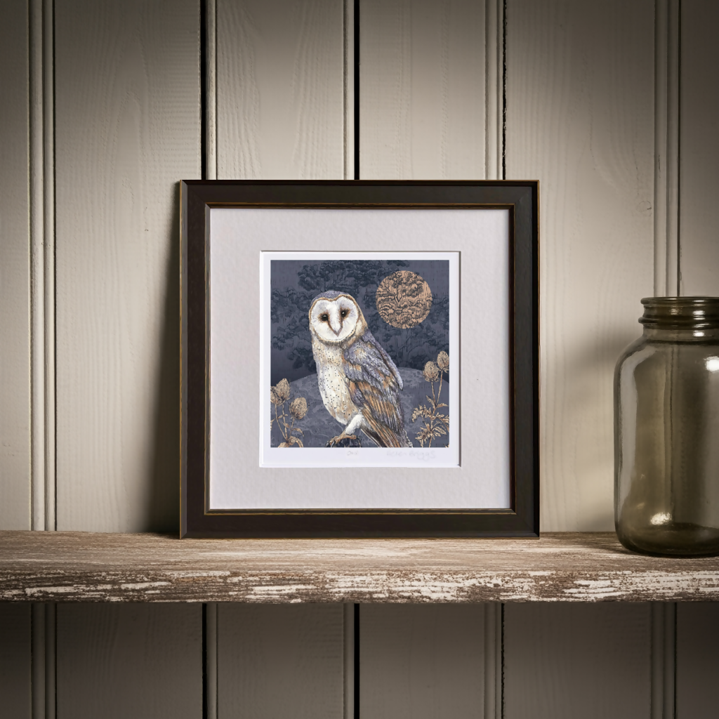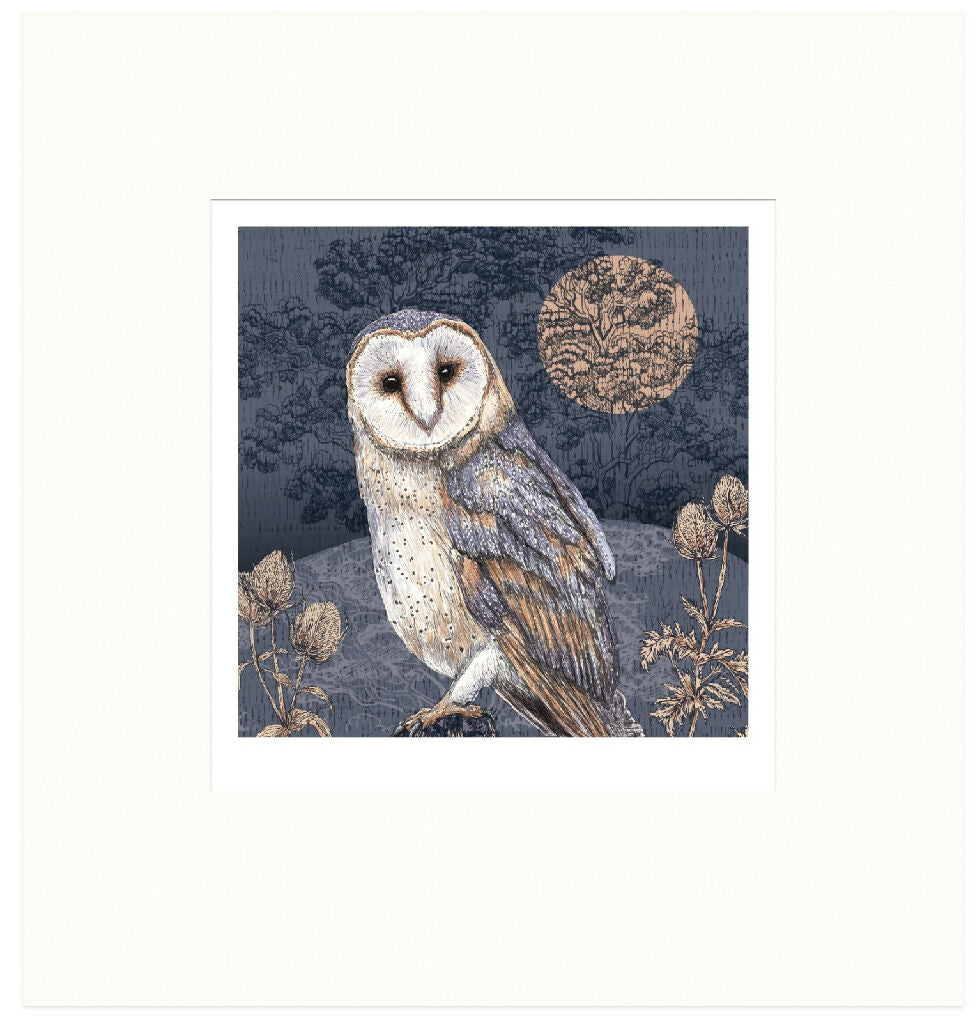 Inspired by the beauty of the British Countryside this hand-drawn print with an etched feel depicts a Barn Owl in soft denim blues, rose gold Harvest moon and inky blues in night time fields.