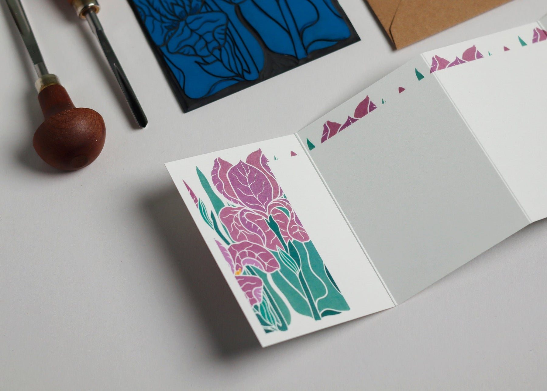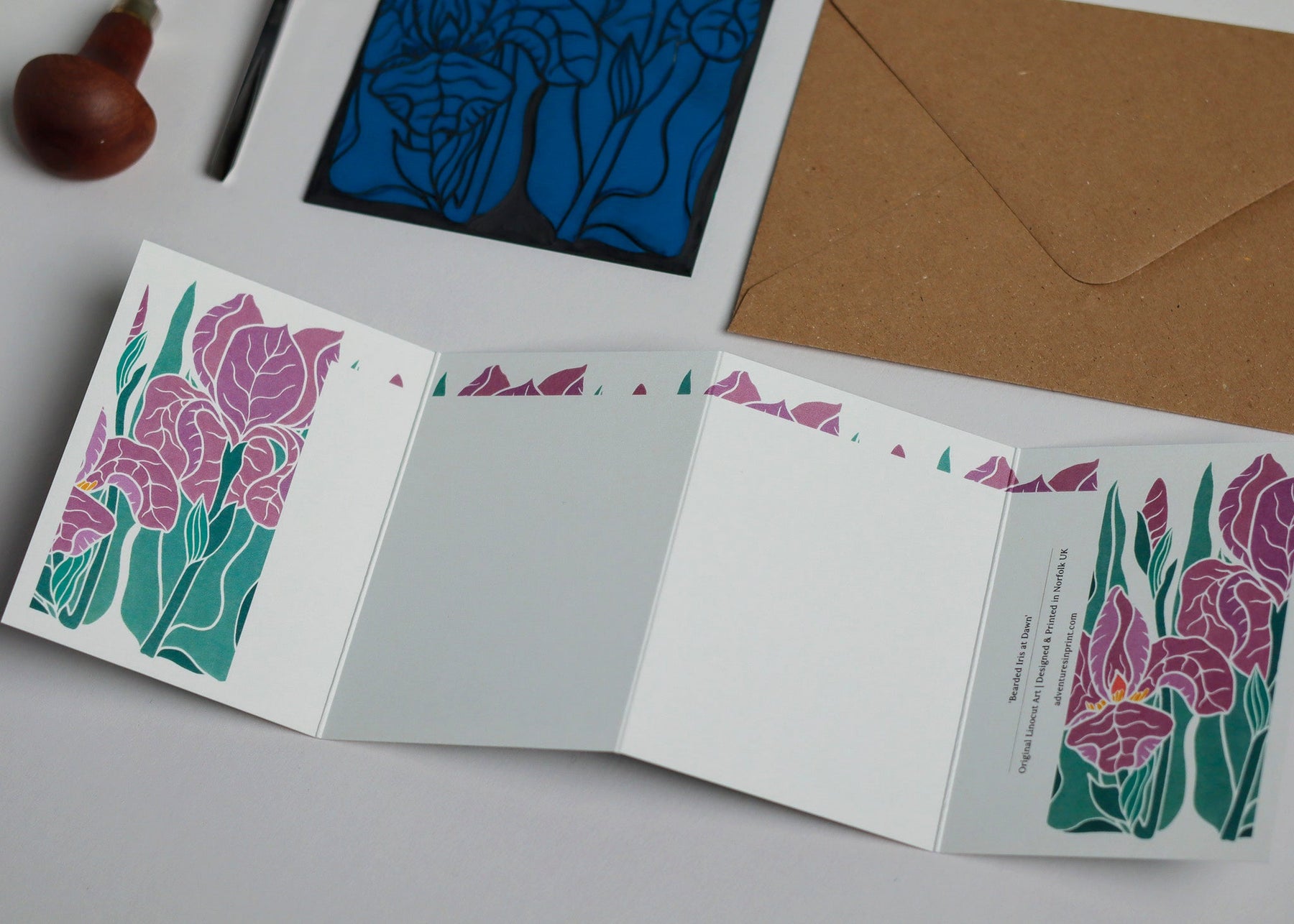 Sculptural petals in dusky mauve and soft purple - iris reimagined in evening tones, as if glimpsed in a garden at dusk when the light has softened and colours have deepened. This original linocut portrays their dramatic ruffled form in the muted palette of dusk. Each intricate petal carved with care in my Norfolk countryside studio.