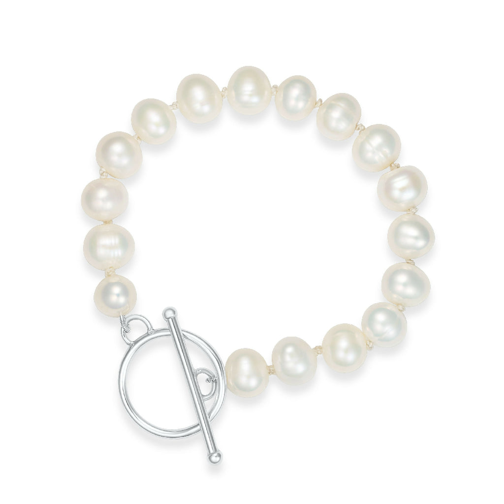 These beautiful natural pearls are hand knotted on silk using traditional techniques The bracelet is secured with a silver toggle clasp crafted from 1.8mm sterling silver wire, finished with silver ball ends on the bar.