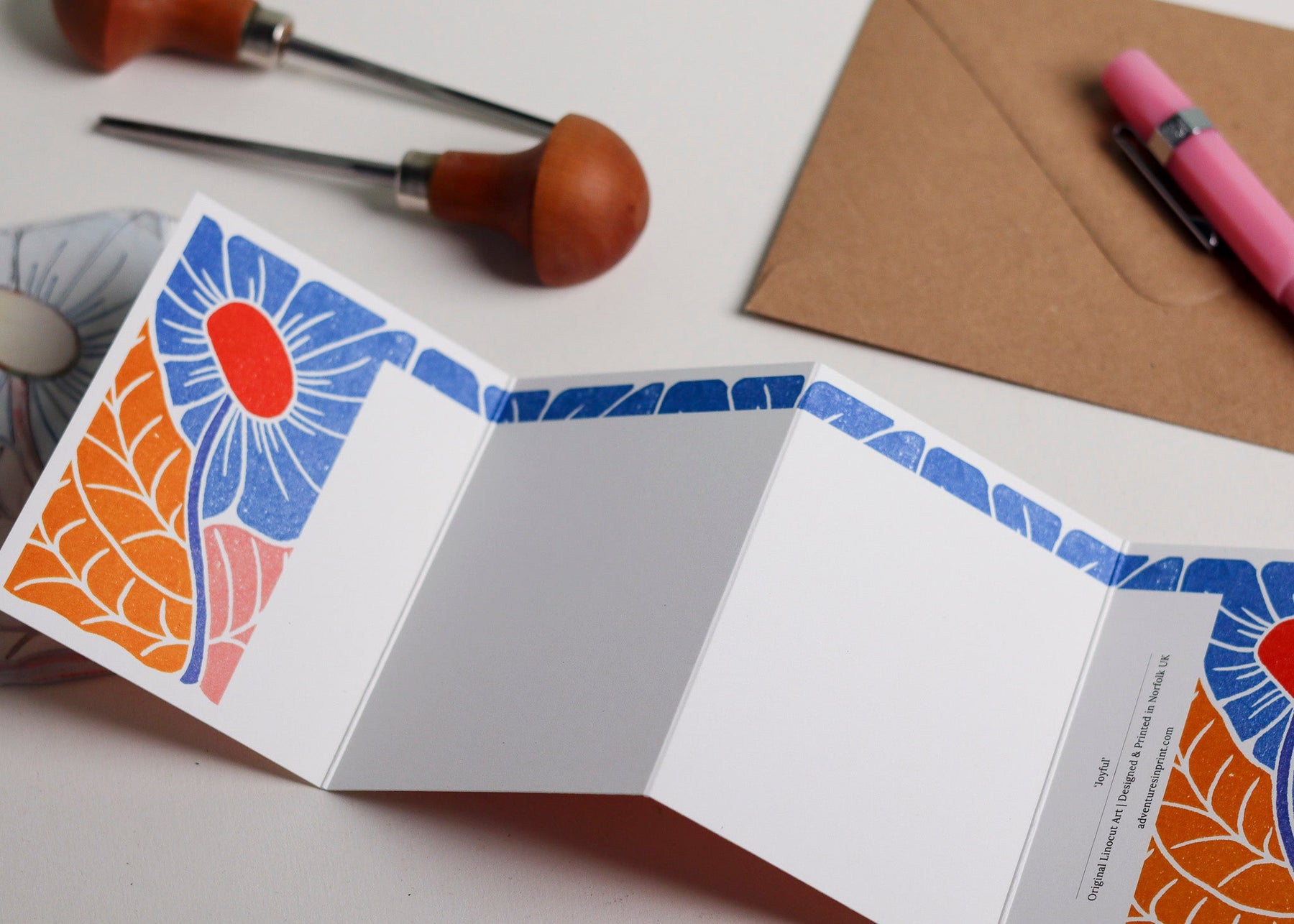 This bold concertina card features my 'Joyful' linocut design - a hand carved abstract flower in vibrant blues, warm oranges, and coral. Appearing here for the first time in a repeating pattern, it unfolds like a botanical garland, bringing continuous colour and optimism to any message.