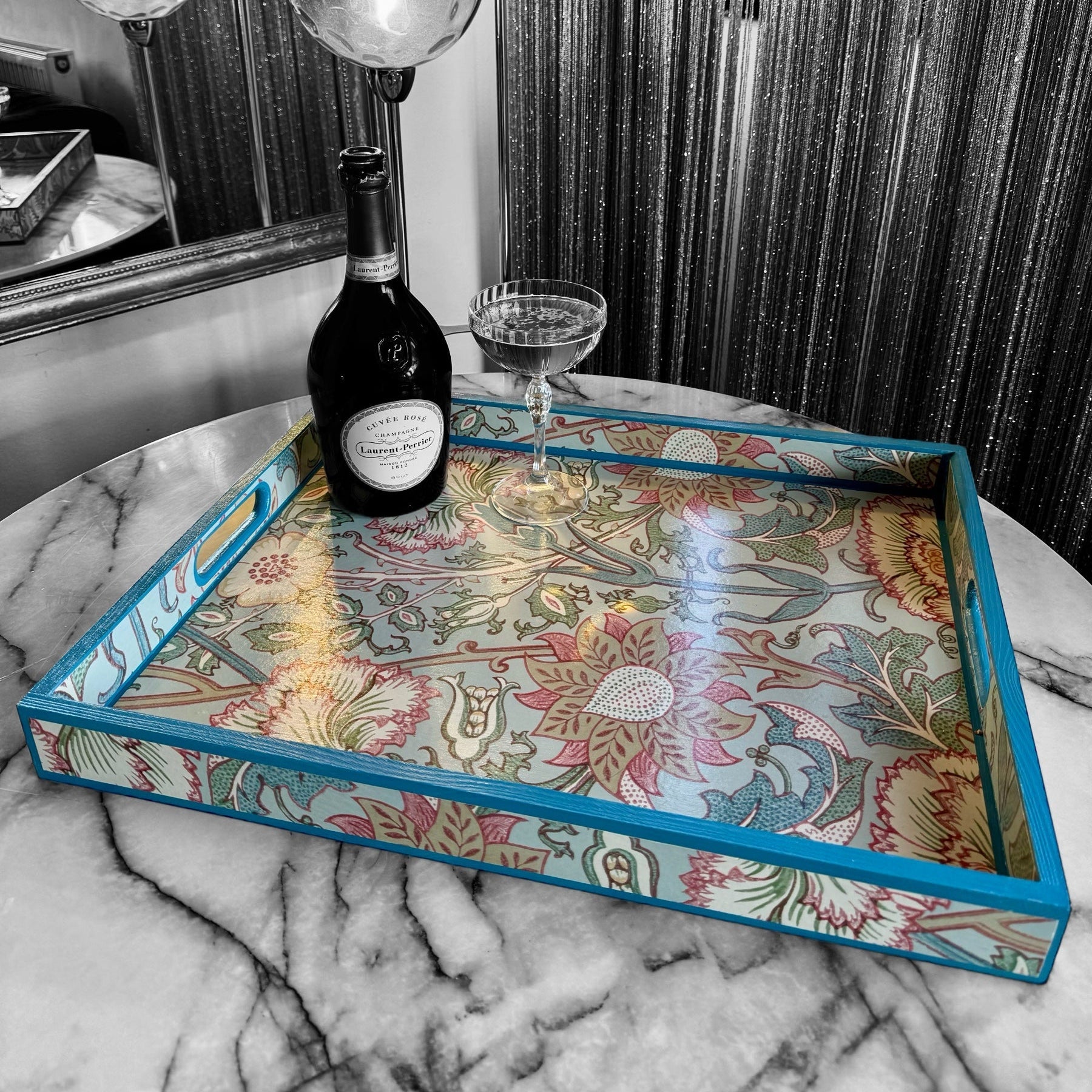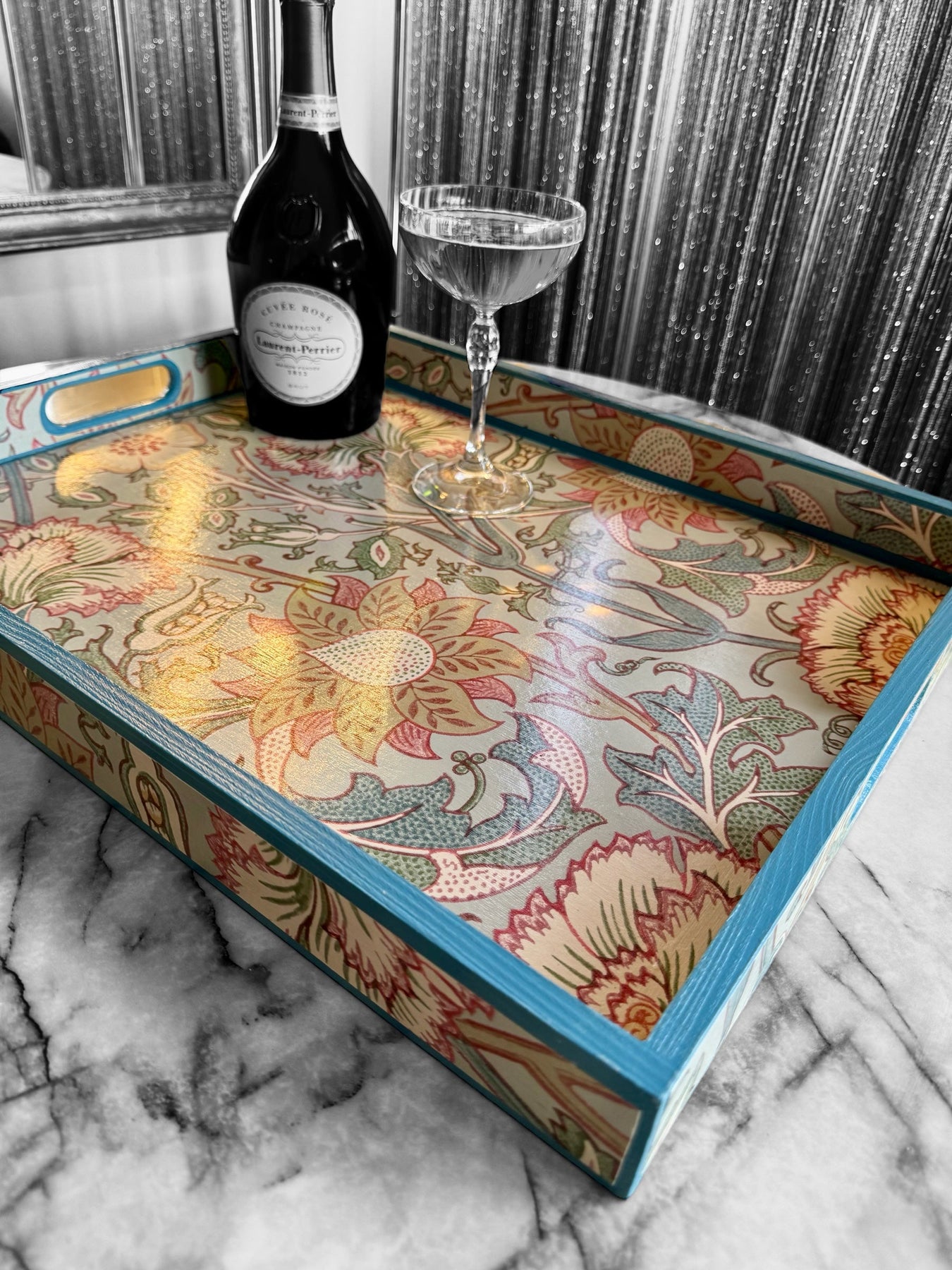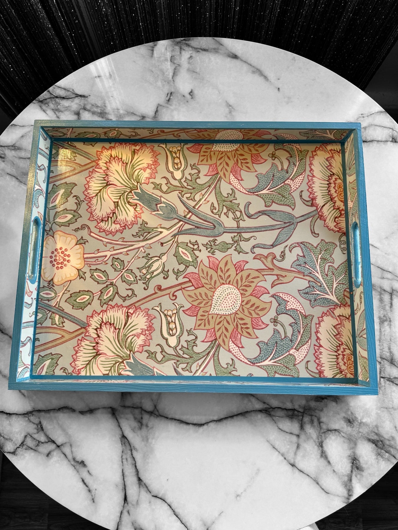 Create elegance in your space with this luxury handmade tray, featuring Morris & Co Pink and Rose in soft Eggshell. Hand-painted Air Force Blue trim, solid pinewood, and durable satin seal make it perfect for styling, serving, and refined living.