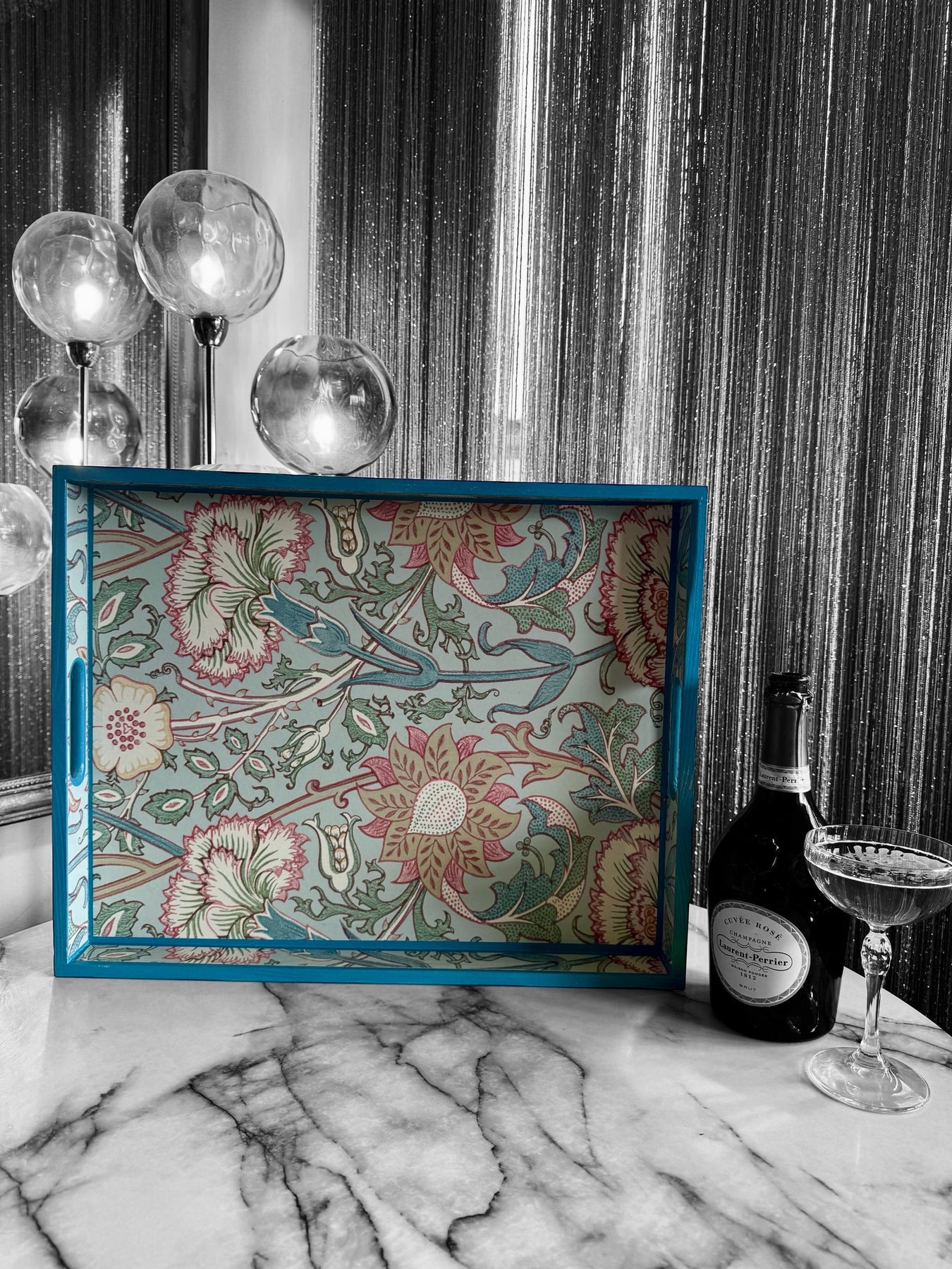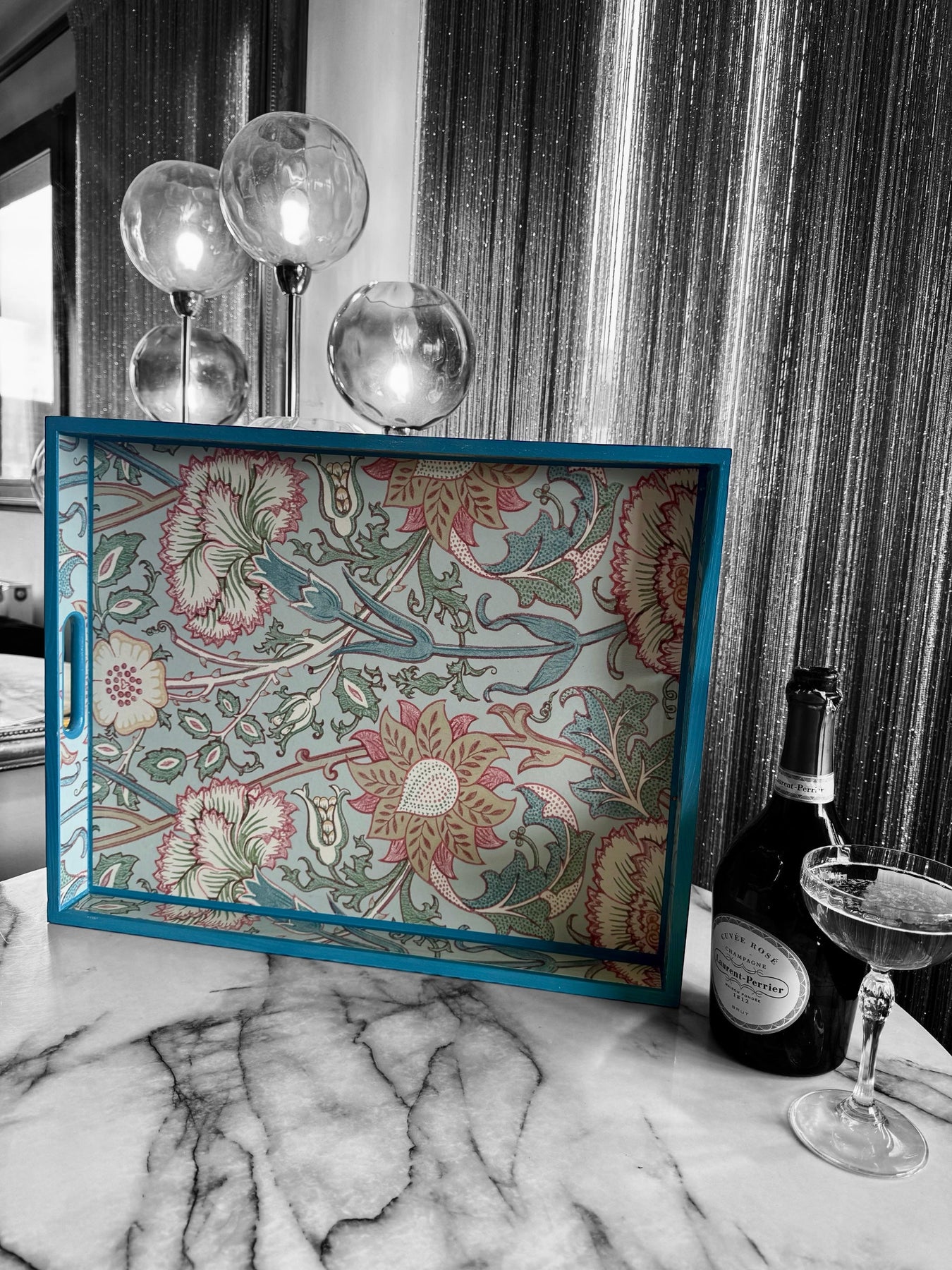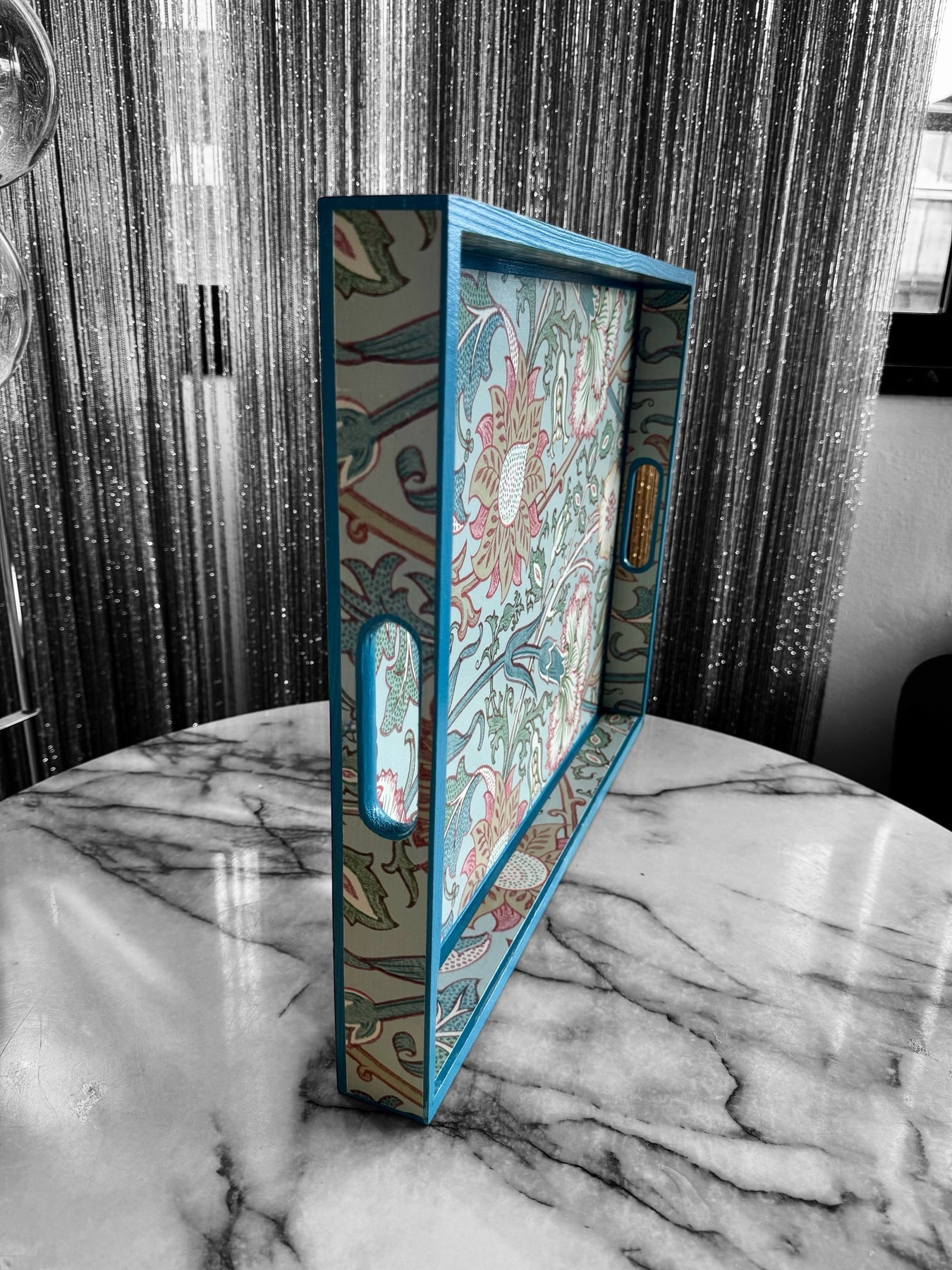 Create elegance in your space with this luxury handmade tray, featuring Morris & Co Pink and Rose in soft Eggshell. Hand-painted Air Force Blue trim, solid pinewood, and durable satin seal make it perfect for styling, serving, and refined living.