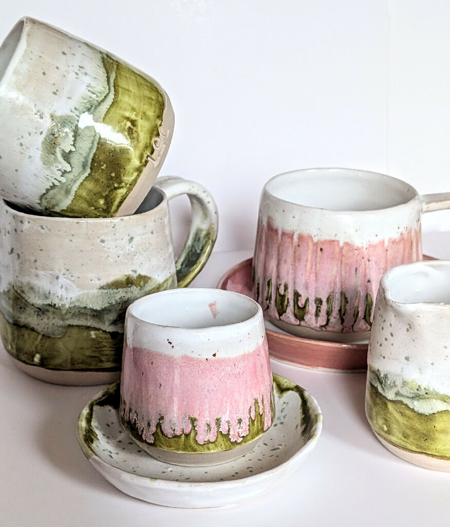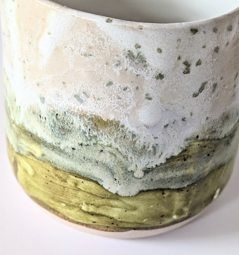 Each mug is individually crafted on the wheel, so no two are exactly alike—each has its own gentle curves, weight, and personality. The rich green glaze, dotted with soft lighter speckles, evokes the feeling of moss glimmering in soft sunlight, adding an organic, earthy touch to every sip.
