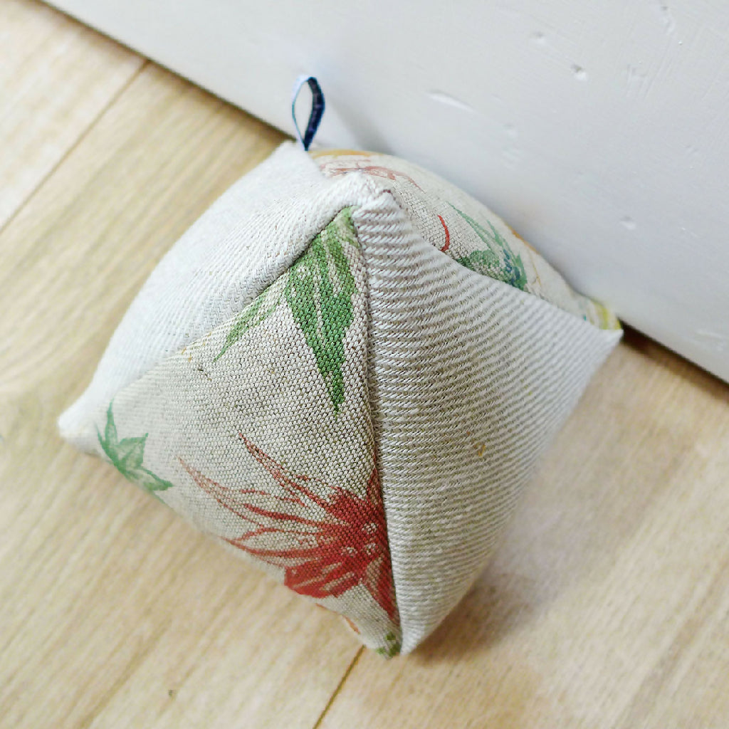 A Leaf Flurry linen doorstop made from Charlotte's maple leaf print fabric and natural linen.