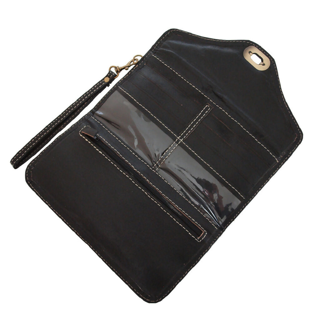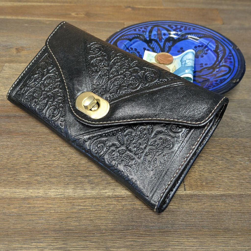 Our Large Leather Purse is the perfect way to stand out from the crowd without breaking your bank balance. The vintage style soft leather and hand-stamped design are eye-catching without being garish. This genuine black leather purse has multiple compartments and card slots, making it the perfect purse to help you stay organised.