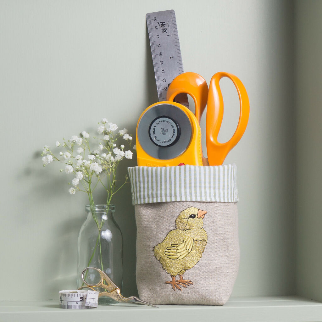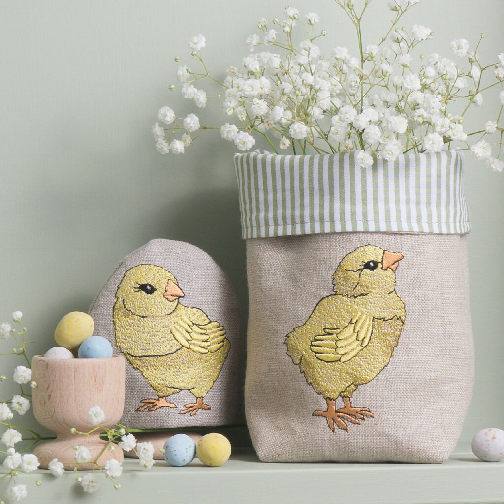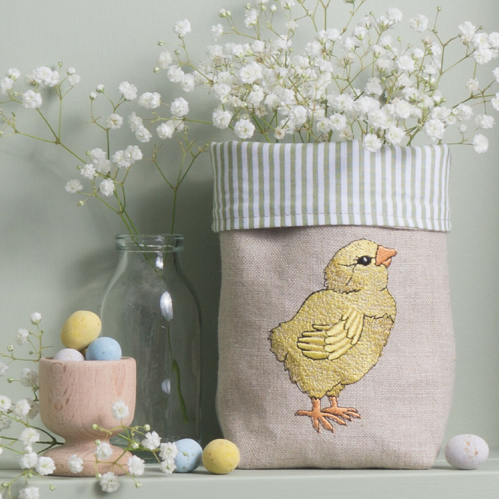 Featuring an embroidered fluffy little chick, this fabric pot is perfect to fill with chocolate eggs for a beautiful Easter gift.