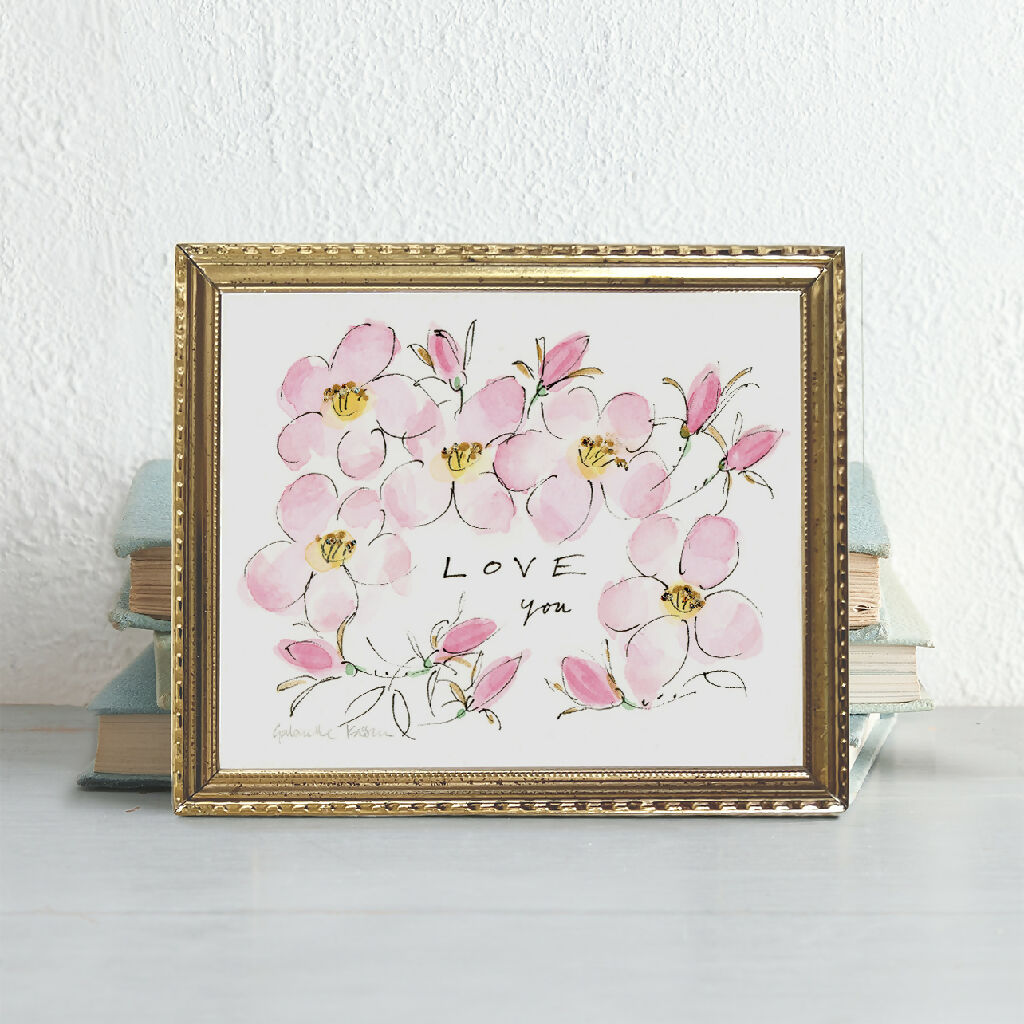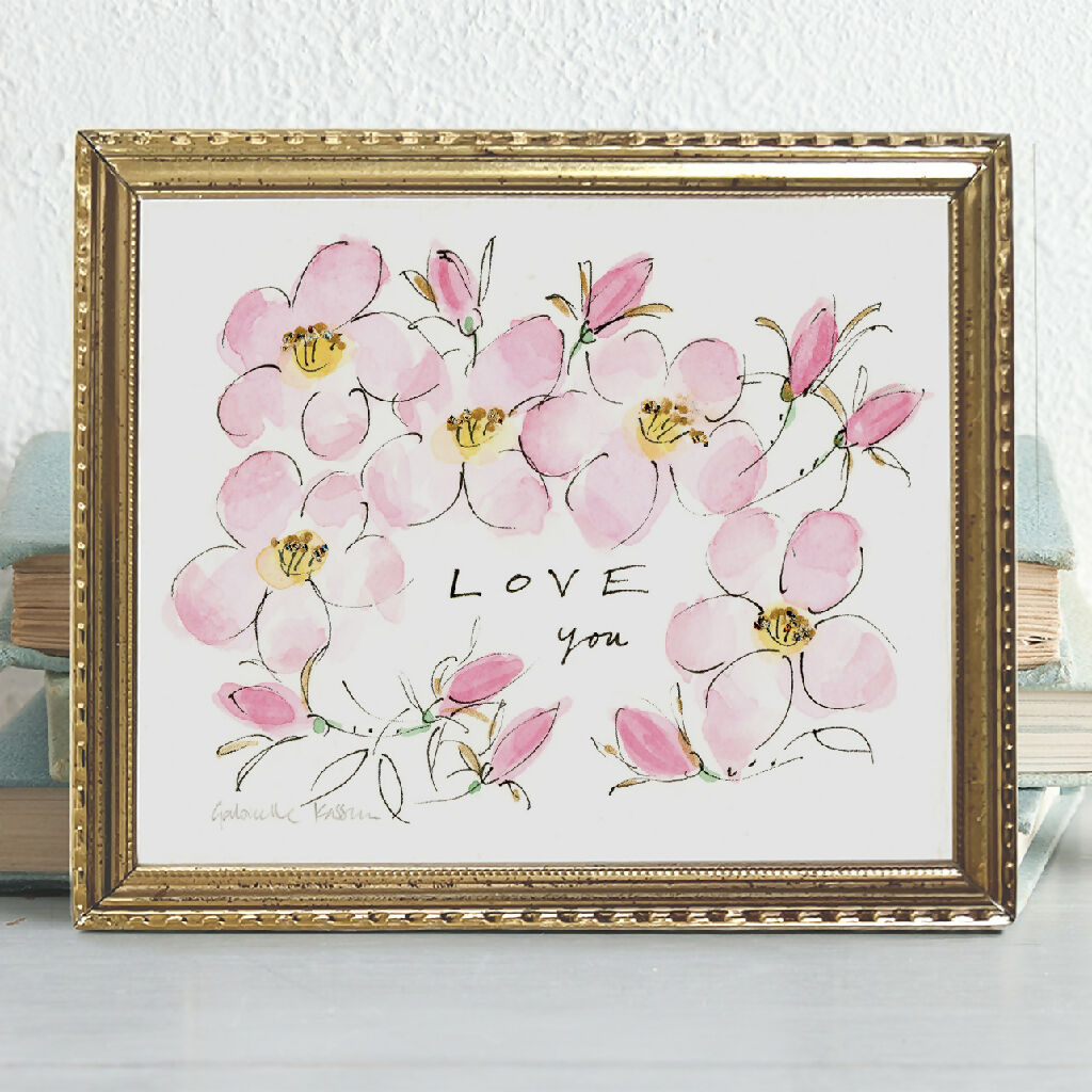 'Love You' rose border is a small framed original decorative illustration of Dog Roses.