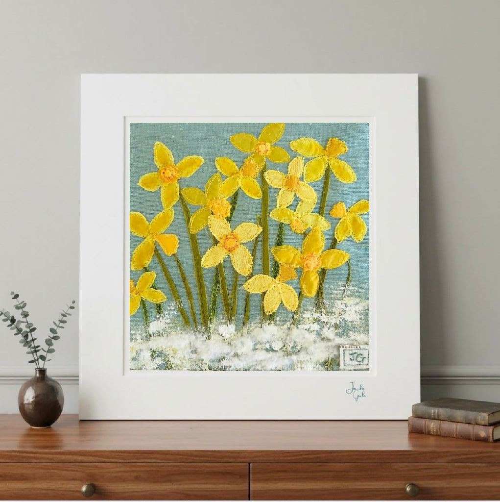 Beautiful early daffodils with a sprinkling of frost, created in textile art.