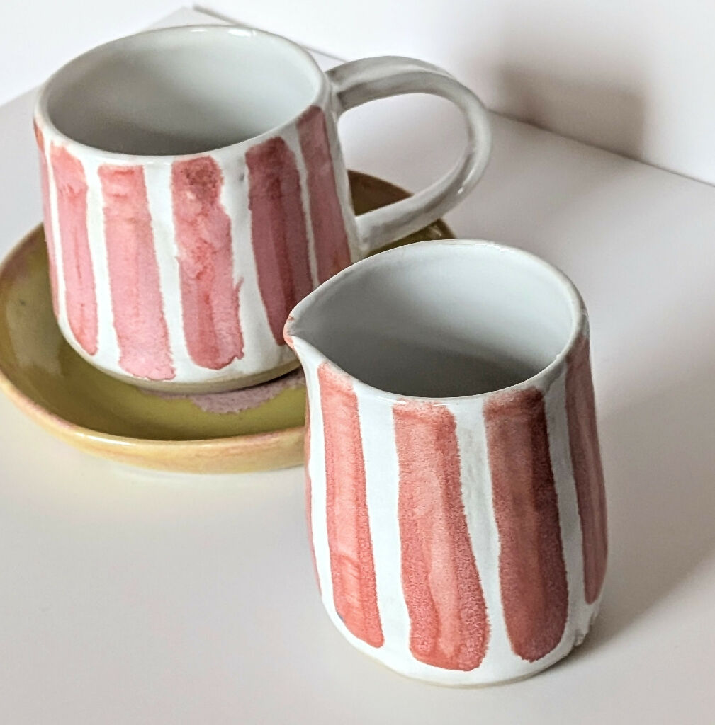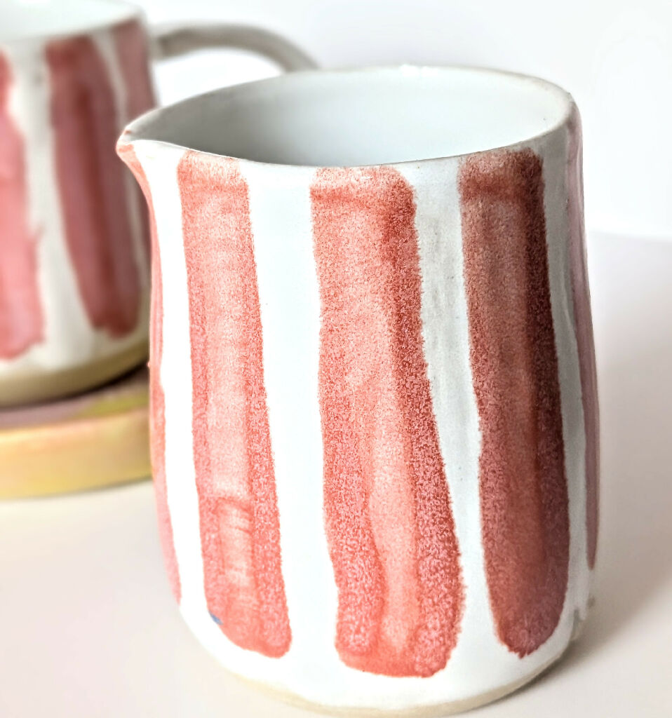 Hand-Thrown Stoneware Milk Jug – Moss & Blossom Pink Stripe