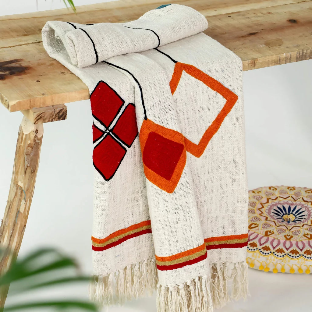 The throw features a soft ivory colour that complements any interior decor, while the overlaying embroidery with multi-colored accents in arrow or kite shapes complements its overall look.