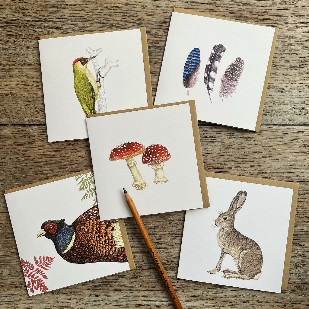 Pheasant, Feather, Toadstool, Hare and Green Woodpecker.