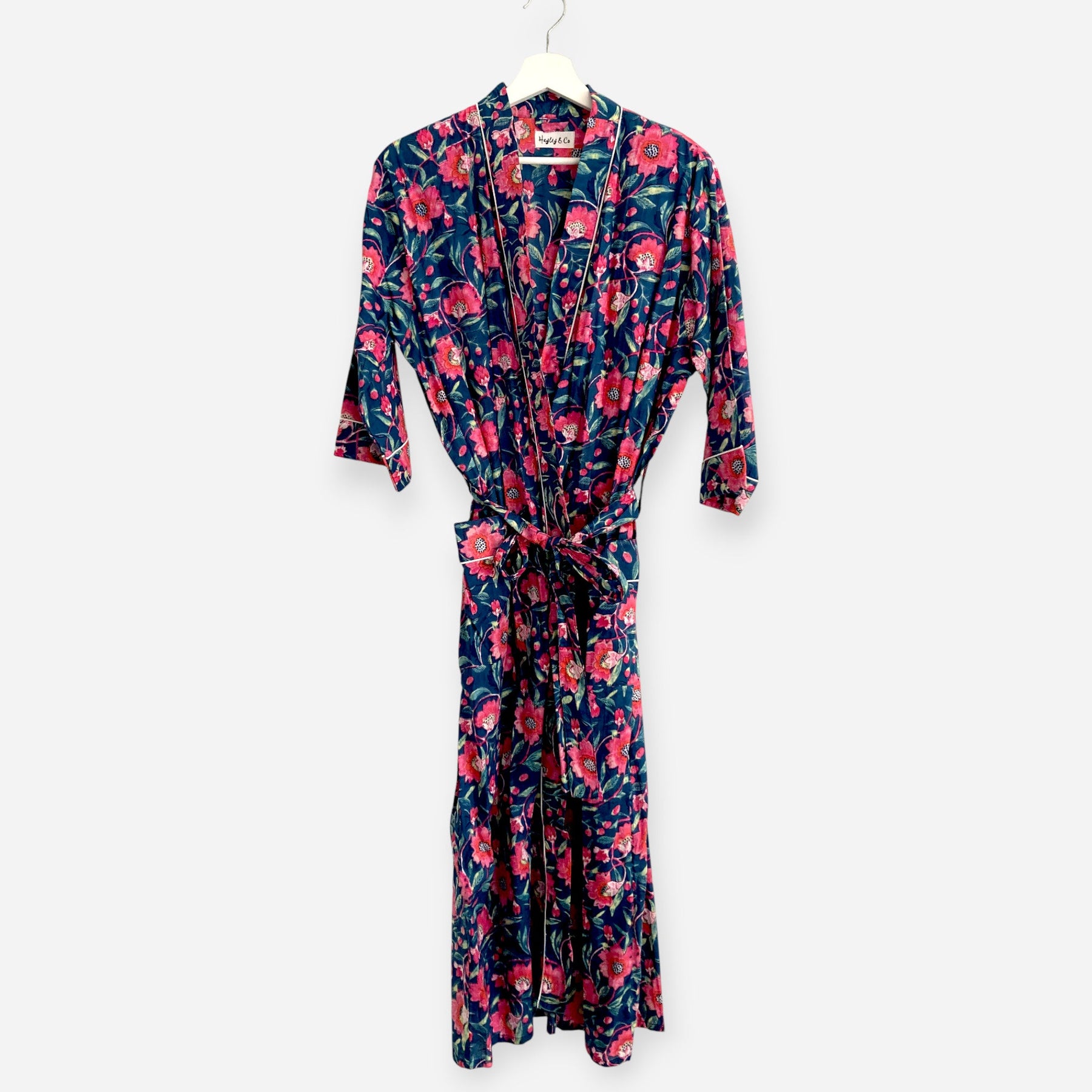 This lightweight navy blue and pink floral block print cotton kimono style dressing gown is ideal for warm summer days when you want something breezy and comfortable.