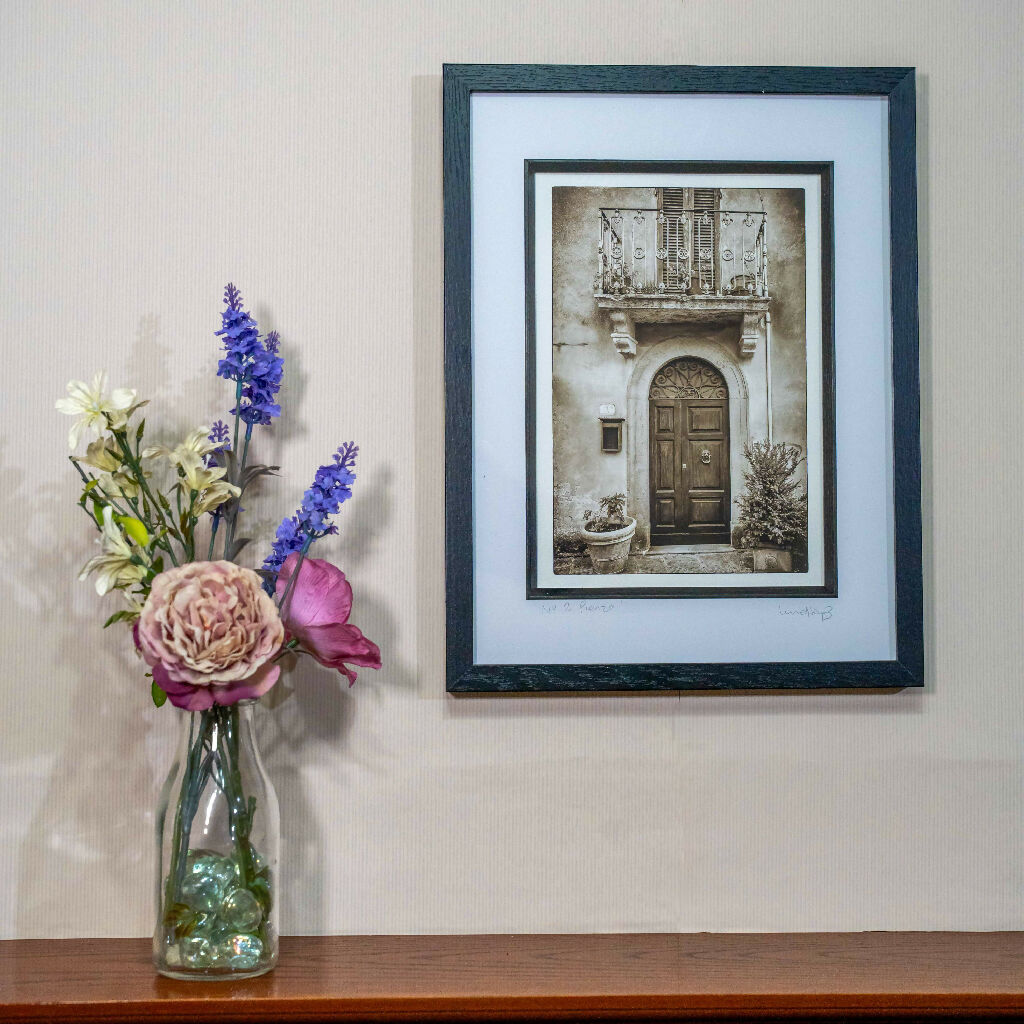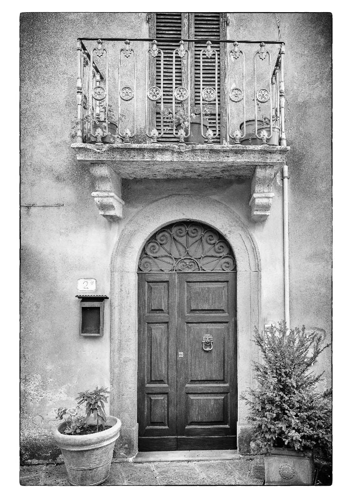 A stunning monochrome photograph that encapsulates the charm of a traditional Tuscan home. The image draws attention to the ornate wooden door above which, an exquisite original cast iron balcony is adorned with terracotta pots. Printed on premium fine art paper and presented in elegant black frames with a deep black inlay