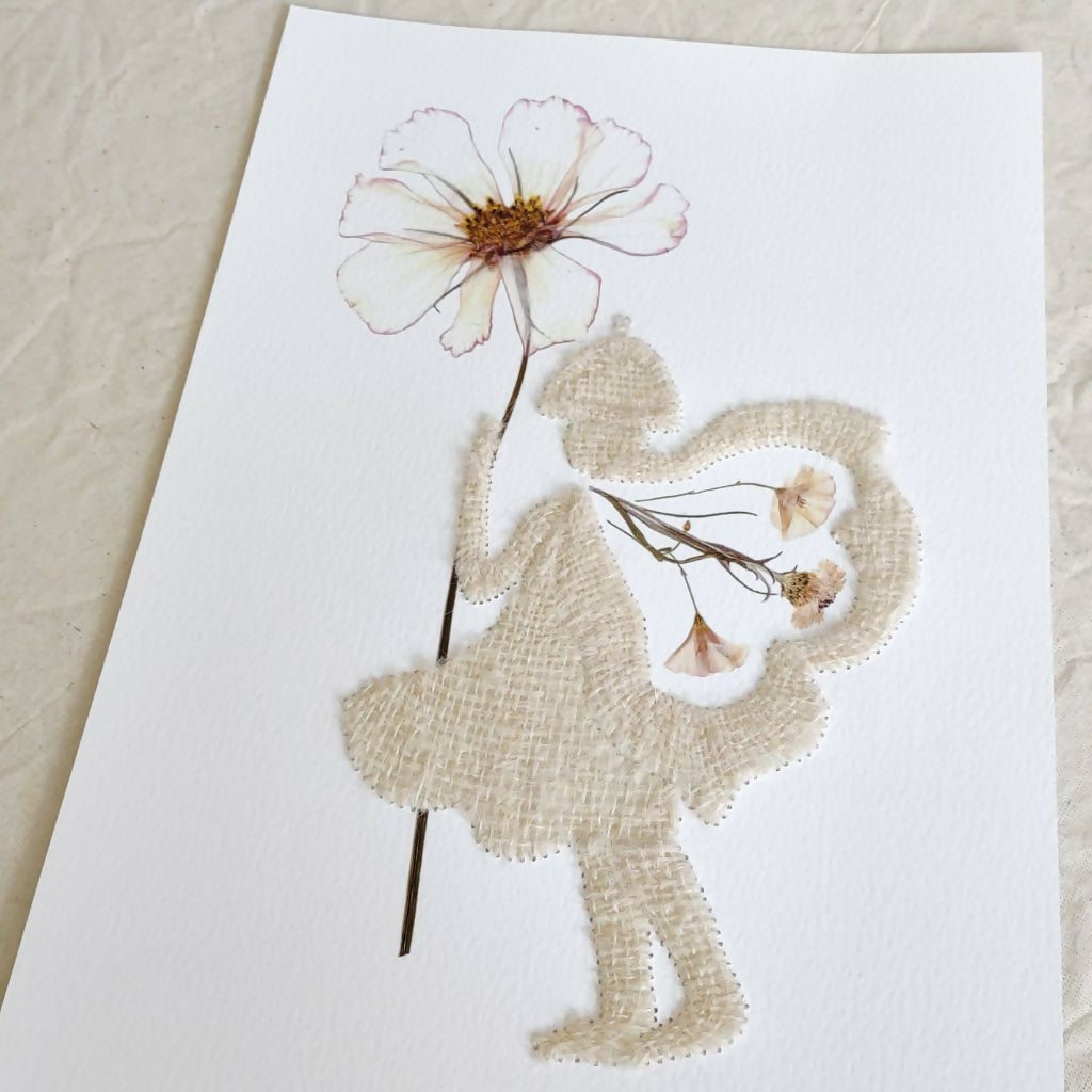Do you love fairies, and textile art? If so, you’ll love this hand embroidered giclee print of pressed cosmos flowers and a linen fairy.