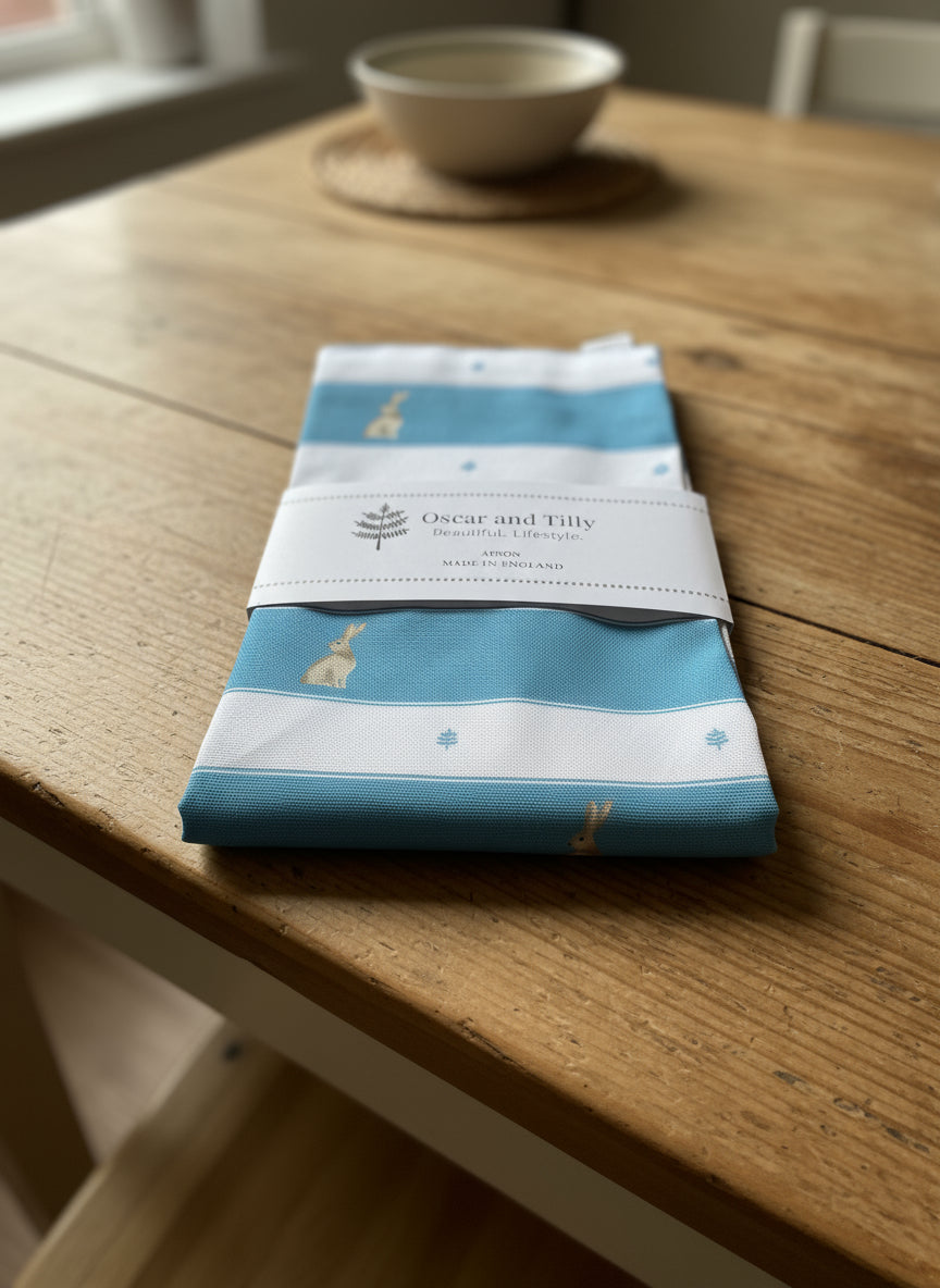 Beautifully designed and made in the UK, Oscar and Tilly are delighted to introduce their new range of Kitchen textiles with these lovely Aprons. Hares dominate our British Countryside hence choosing these wonderful creatures for our soft textiles. Our Aprons are wrapped in a lovely belly band so make a perfect gift or just to treat yourself.! A lovely pop of colour to your kitchen of our wonderful Hares and stripes.